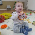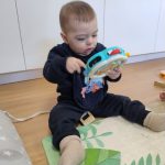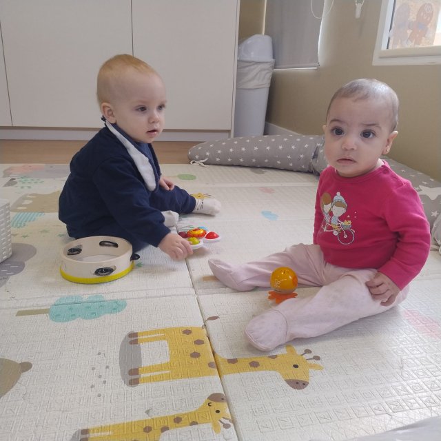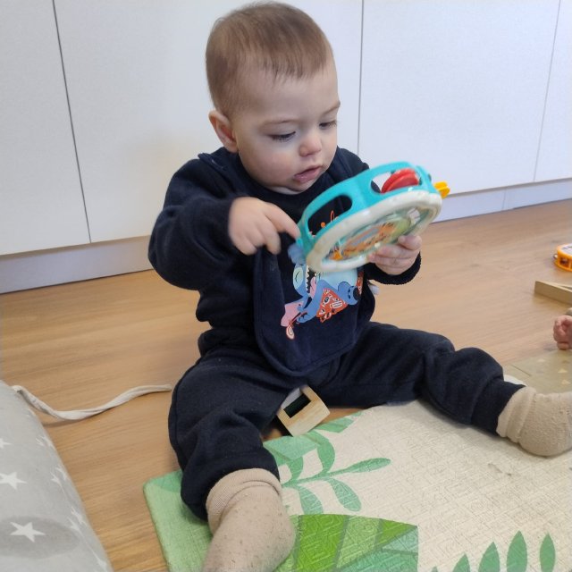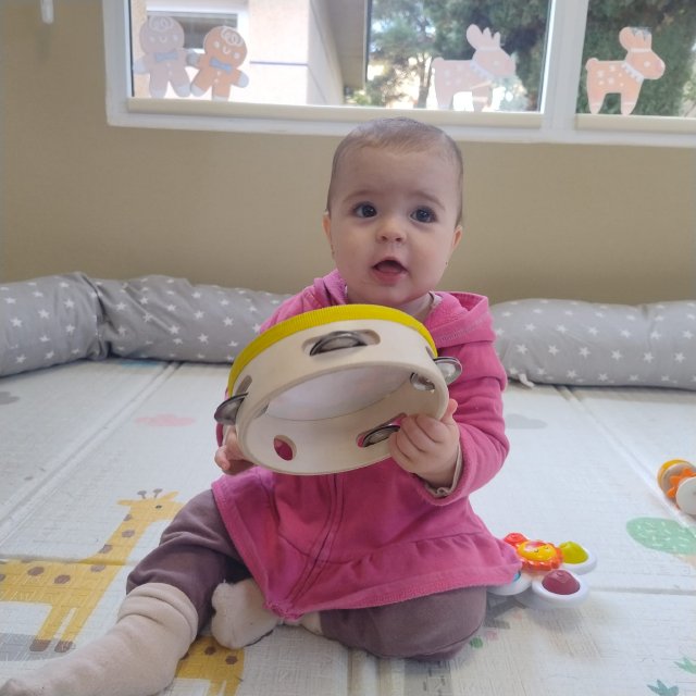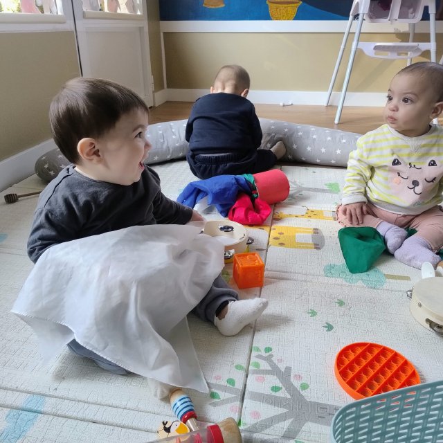 La música tampoco falta en estas semanas. Las panderetas adaptadas a sus manos les permiten experimentar con el sonido, agitar, escuchar y participar en breves momentos musicales que llenan el aula de ritmo y alegría.