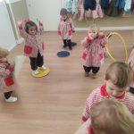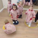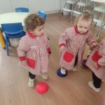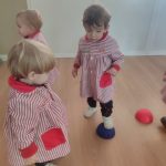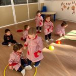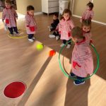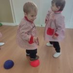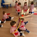 Durante las sesiones de psicomotricidad utilizamos materiales específicos que invitan al juego libre y a la experimentación. Los aros, por ejemplo, se transforman en caminos que recorrer, túneles simbólicos o lugares donde entrar y salir una y otra vez. Los puntos de apoyo, blandos y seguros, permiten trepar, mantener el equilibrio, saltar o simplemente probar diferentes maneras de moverse. Cada elemento se convierte en una oportunidad para que descubran sus posibilidades, mejoren la coordinación y vivan el movimiento con alegría.