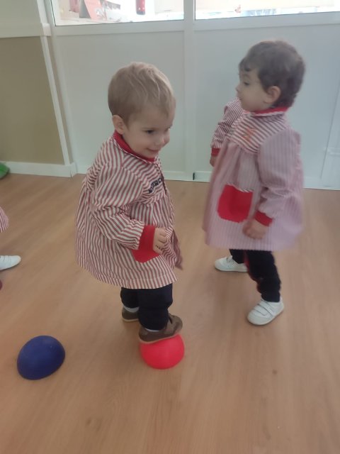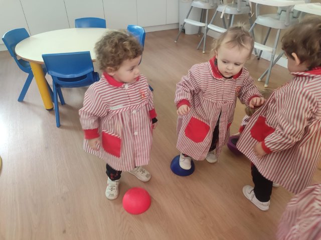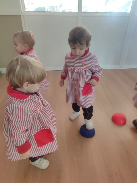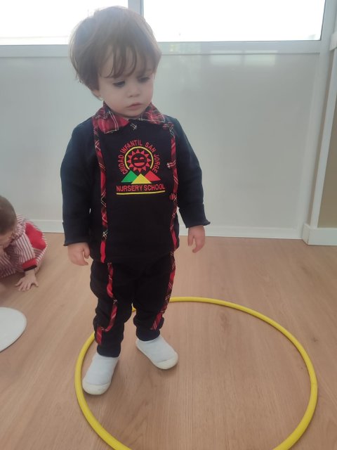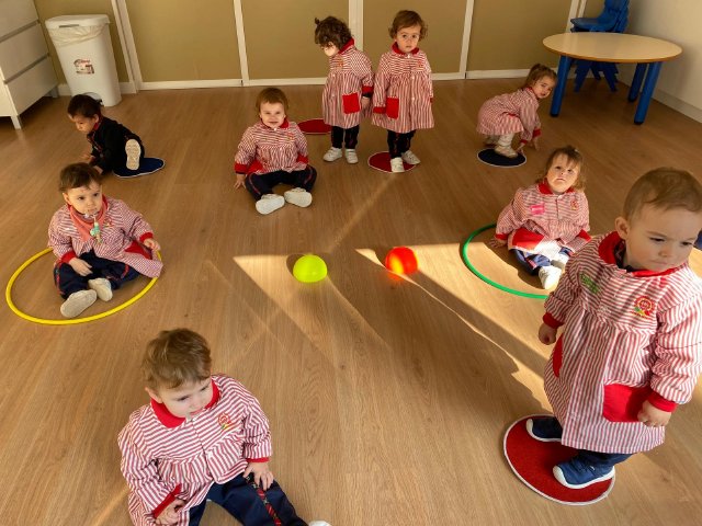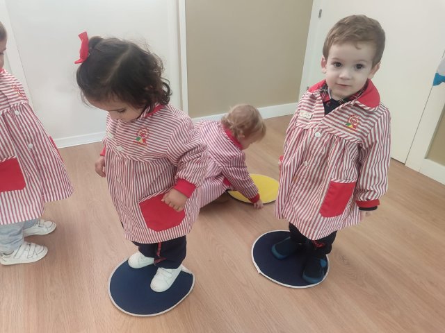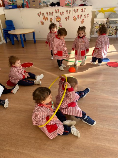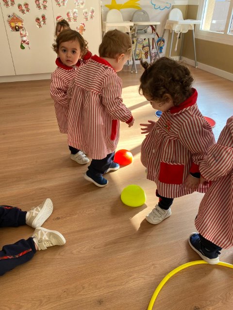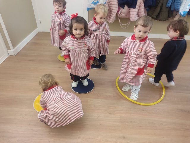 Durante las sesiones de psicomotricidad utilizamos materiales específicos que invitan al juego libre y a la experimentación. Los aros, por ejemplo, se transforman en caminos que recorrer, túneles simbólicos o lugares donde entrar y salir una y otra vez. Los puntos de apoyo, blandos y seguros, permiten trepar, mantener el equilibrio, saltar o simplemente probar diferentes maneras de moverse. Cada elemento se convierte en una oportunidad para que descubran sus posibilidades, mejoren la coordinación y vivan el movimiento con alegría.