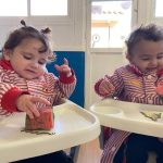En el aula de Azul 3 ya se empieza a notar el ambiente navideño, y los niños y niñas han disfrutado mucho creando un detalle muy especial para llevar a casa. Esta vez hemos preparado un pequeño árbol de Navidad que ellos mismos han decorado usando pintura de dedos, una técnica que les encanta porque les permite experimentar con las manos, las texturas y los colores de una forma muy libre.
