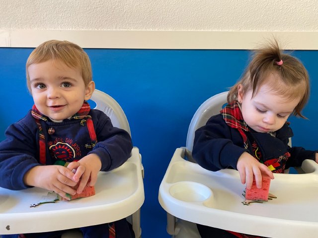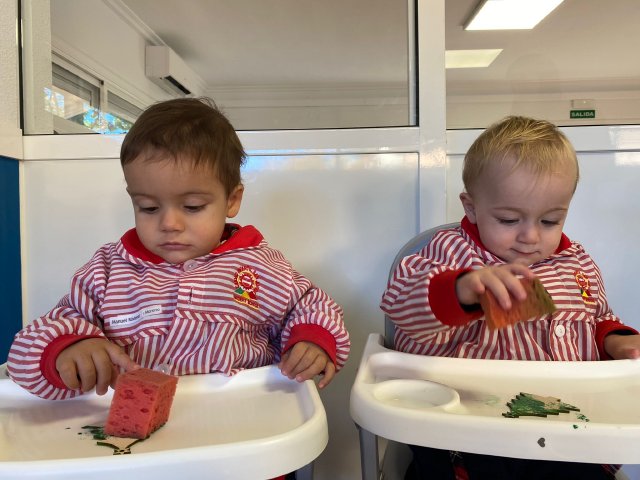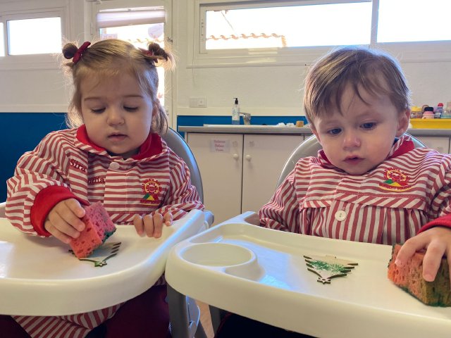 En el aula de Azul 3 ya se empieza a notar el ambiente navideño, y los niños y niñas han disfrutado mucho creando un detalle muy especial para llevar a casa. Esta vez hemos preparado un pequeño árbol de Navidad que ellos mismos han decorado usando pintura de dedos, una técnica que les encanta porque les permite experimentar con las manos, las texturas y los colores de una forma muy libre.