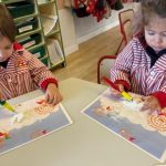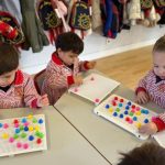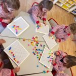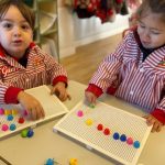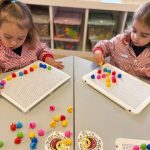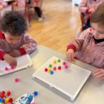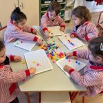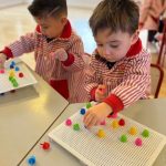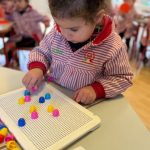 Además, han trabajado con pinchitos de colores, manipulando piezas pequeñas para encajarlas y clasificar colores. Esta actividad potencia la motricidad fina, la coordinación ojo-mano y la capacidad de resolver pequeños retos a través del juego.