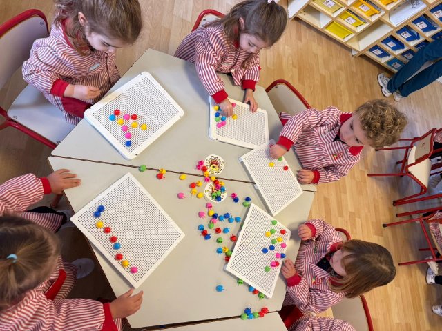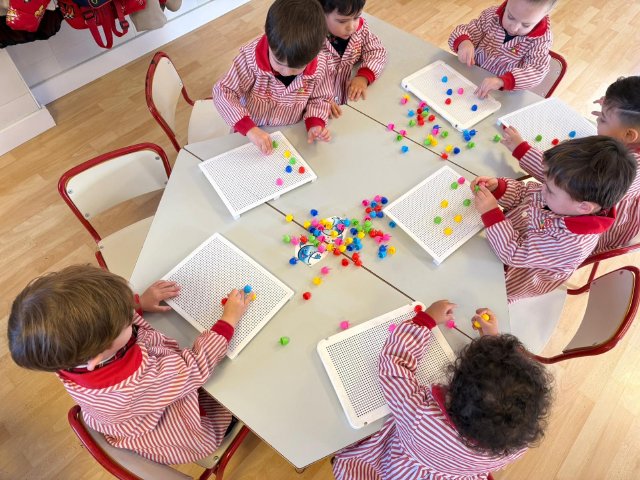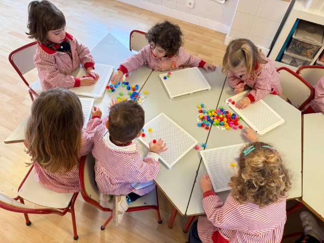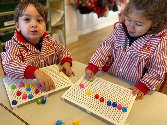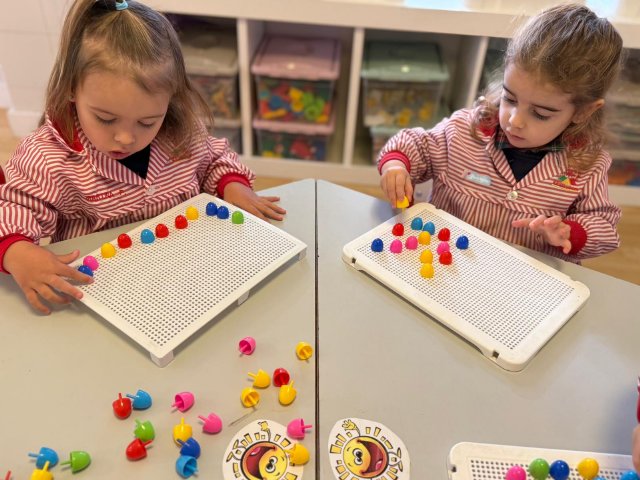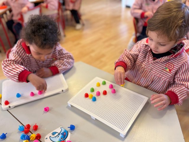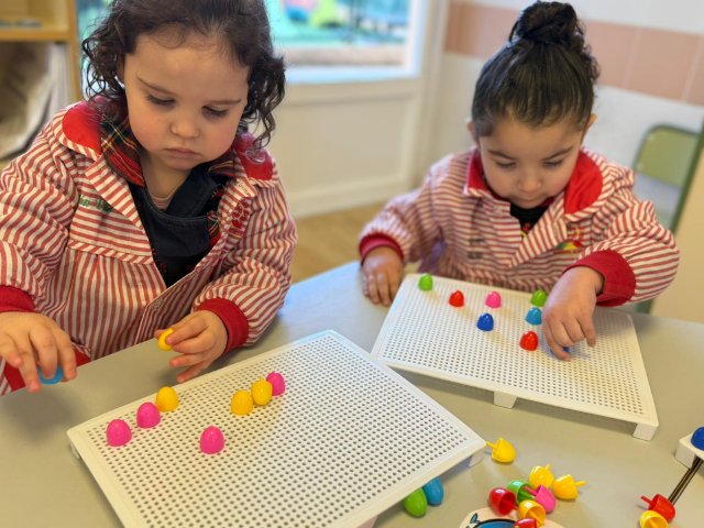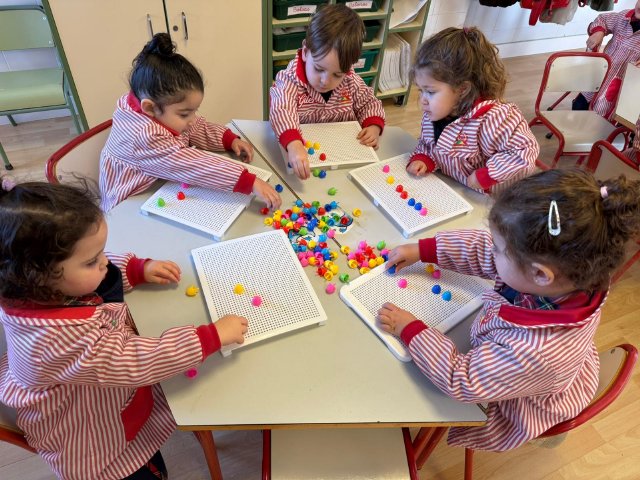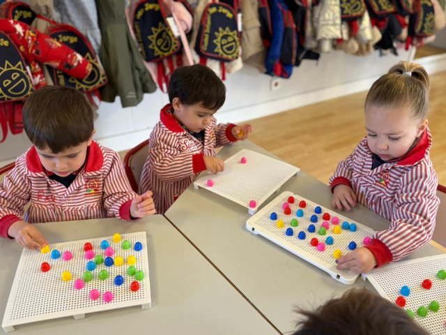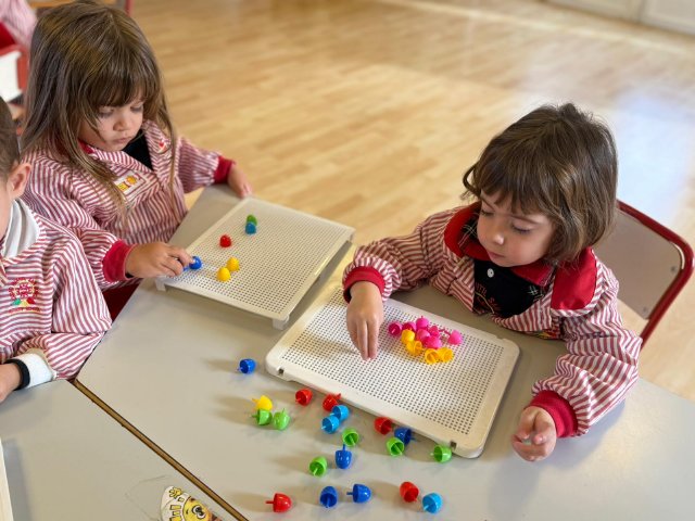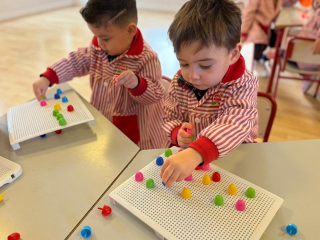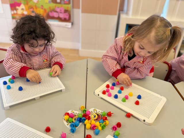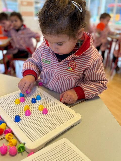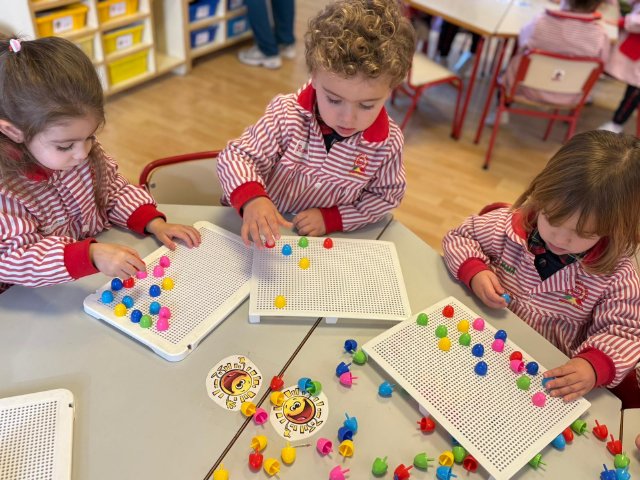 Además, han trabajado con pinchitos de colores, manipulando piezas pequeñas para encajarlas y clasificar colores. Esta actividad potencia la motricidad fina, la coordinación ojo-mano y la capacidad de resolver pequeños retos a través del juego.