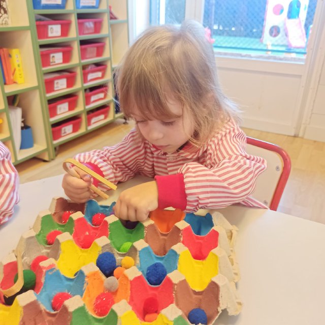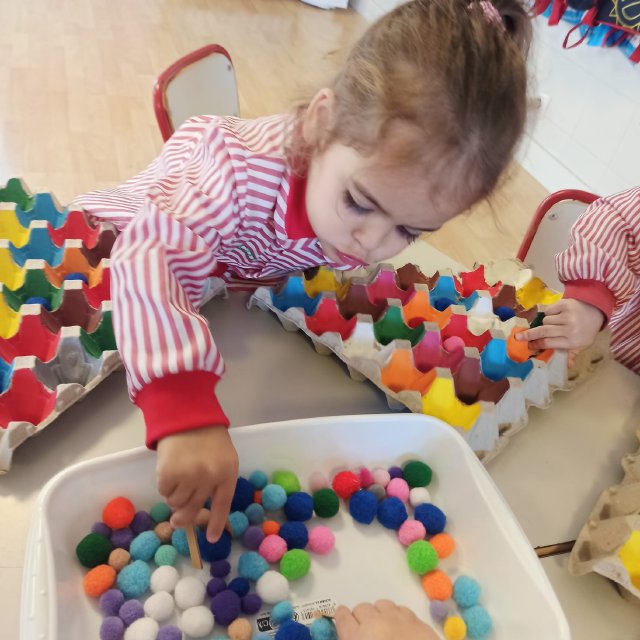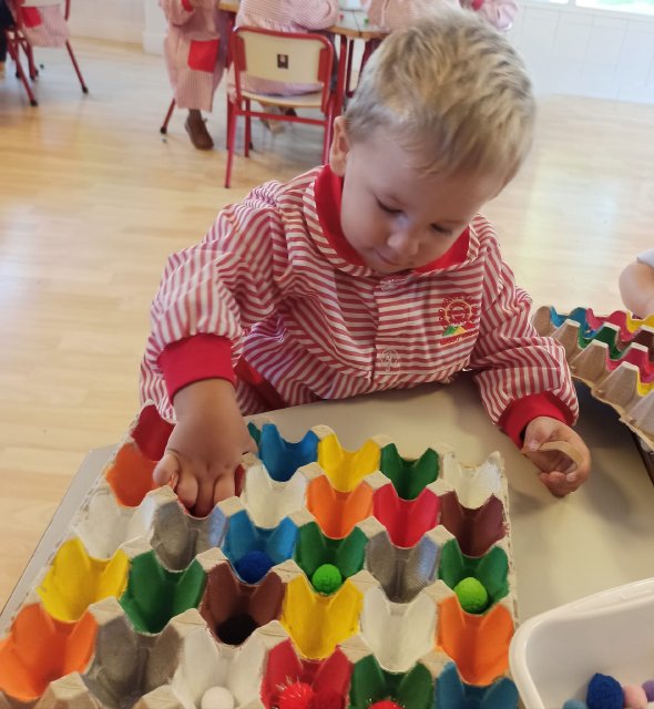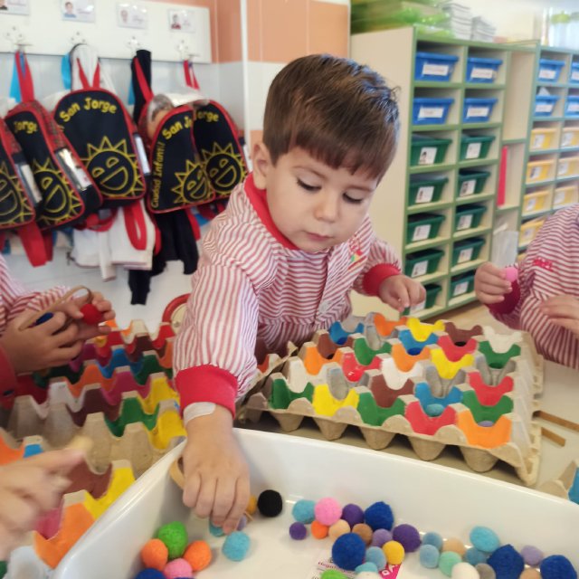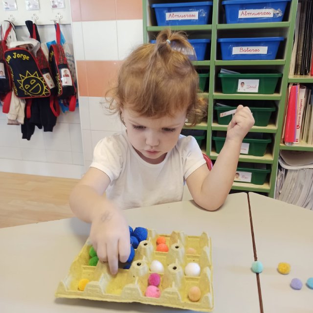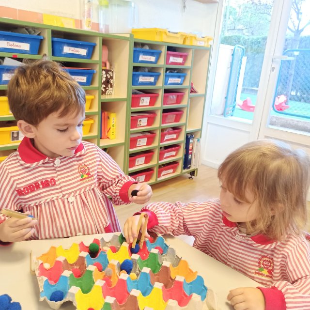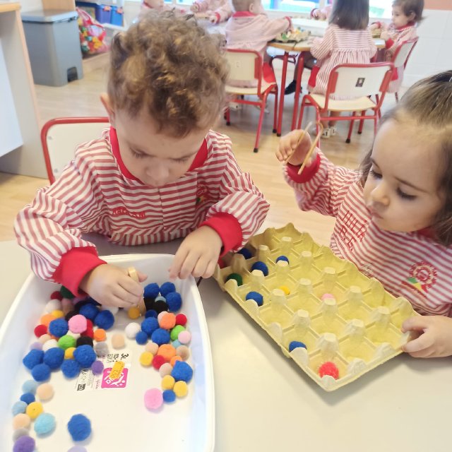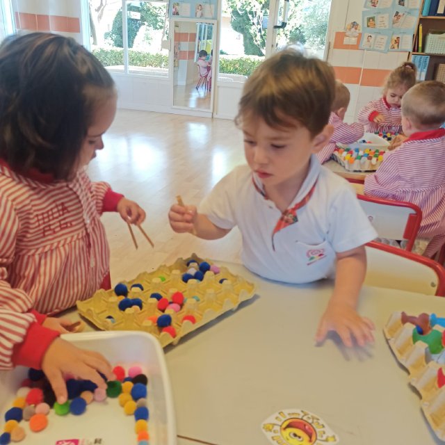 También disfrutaron de una propuesta de trasvases con pompones en hueveras, donde pudieron practicar la coordinación óculo-manual, la concentración y la motricidad fina, mientras jugaban y experimentaban con distintos materiales.
