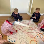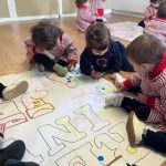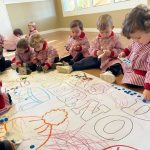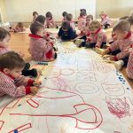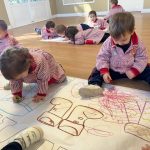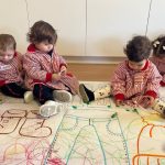 Además, realizamos un mural de invierno elaborado de forma participativa, donde los pequeños experimentan con diferentes materiales, texturas y colores, desarrollando su creatividad y motricidad fina mientras observan cómo cambia su entorno.