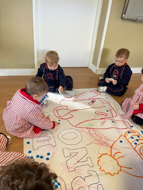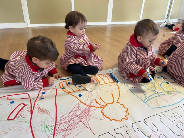 Además, realizamos un mural de invierno elaborado de forma participativa, donde los pequeños experimentan con diferentes materiales, texturas y colores, desarrollando su creatividad y motricidad fina mientras observan cómo cambia su entorno.
