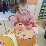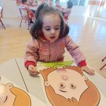 Comenzamos con una propuesta individual de creación de caras, en la que cada niño tenía su propia base y diferentes piezas para pegar ojos, nariz y boca. Esta actividad les invita a observar, decidir, comparar y colocar cada elemento en su lugar, desarrollando la motricidad fina y reforzando la identificación de las partes del rostro.