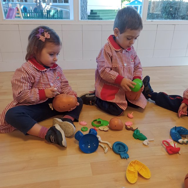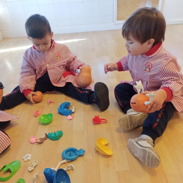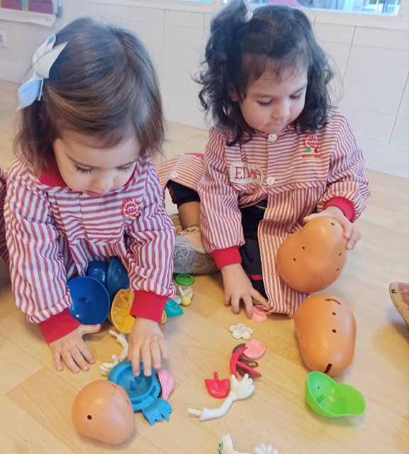 Después continuamos el aprendizaje de forma más lúdica con el clásico Mister Potato, un juego que les encanta. Con sus piezas intercambiables, los niños pudieron experimentar creando caras de todo tipo: algunas muy coherentes… ¡y otras llenas de imaginación! Esta dinámica favorece el pensamiento creativo, la coordinación y el lenguaje, ya que comentan entre ellos lo que van construyendo.