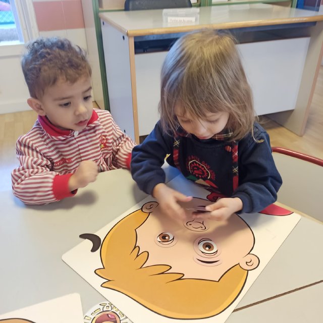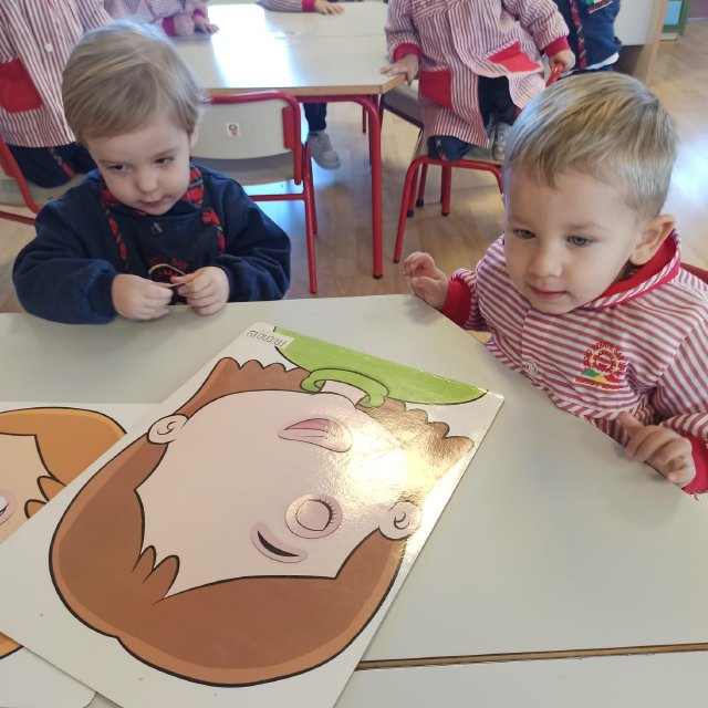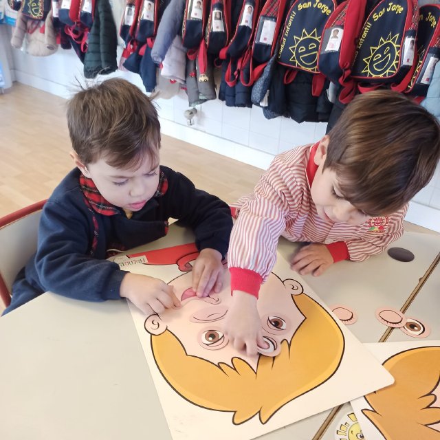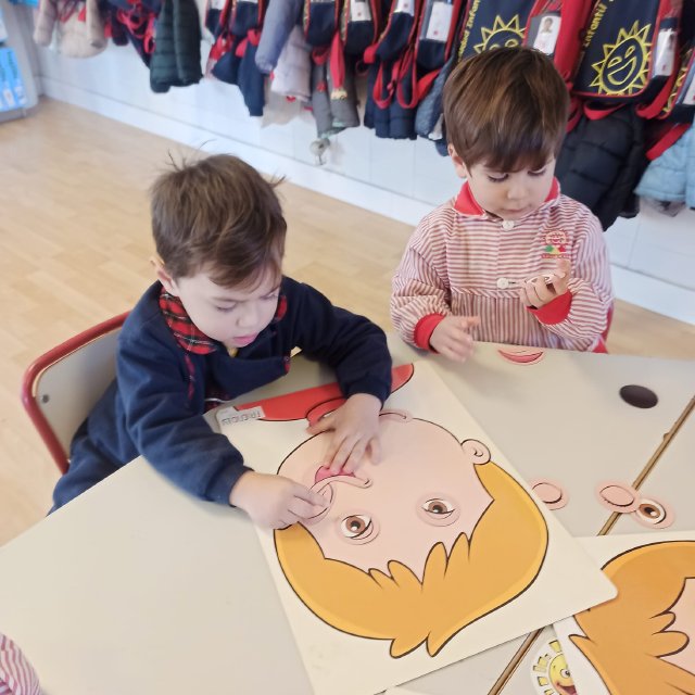 Comenzamos con una propuesta individual de creación de caras, en la que cada niño tenía su propia base y diferentes piezas para pegar ojos, nariz y boca. Esta actividad les invita a observar, decidir, comparar y colocar cada elemento en su lugar, desarrollando la motricidad fina y reforzando la identificación de las partes del rostro.
