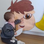 Primero, jugamos con el espejo, un recurso que siempre despierta curiosidad en los más pequeños. Cada niño pudo observar su carita, sus gestos y sus expresiones, descubriendo poco a poco que ese reflejo que ven… ¡son ellos mismos! Fue un momento lleno de sonrisas, miradas sorprendidas y pequeños toques al cristal.