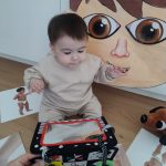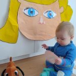 Después, pasamos a una propuesta más creativa: un mural con diferentes caras en el que los niños debían colocar ojos, nariz y boca en su lugar. Esta actividad les permitió manipular, experimentar y explorar, mientras reforzaban de manera natural el conocimiento de las partes de la cara.