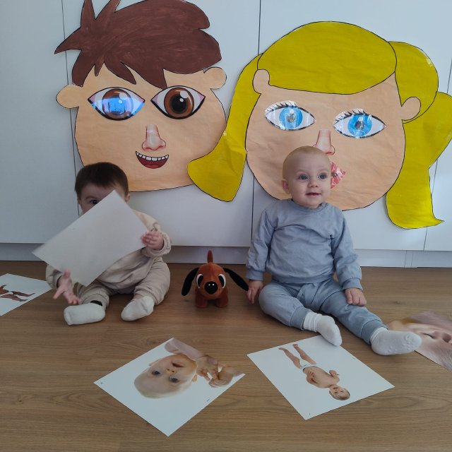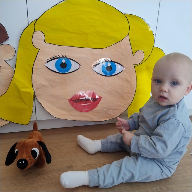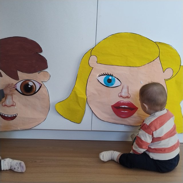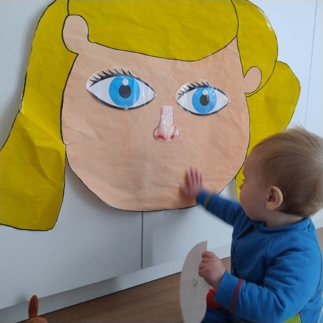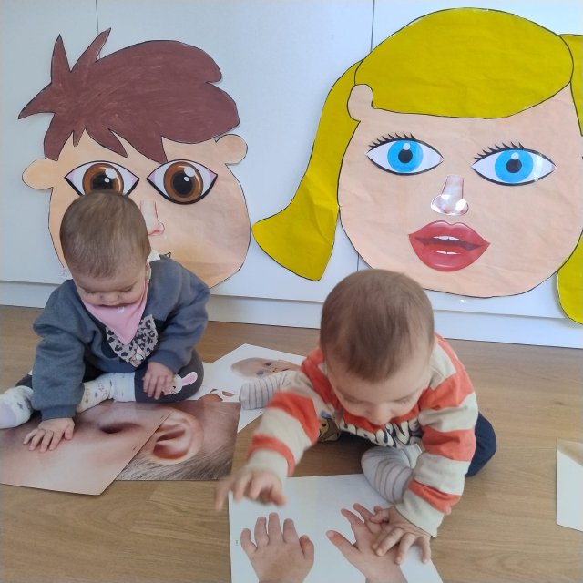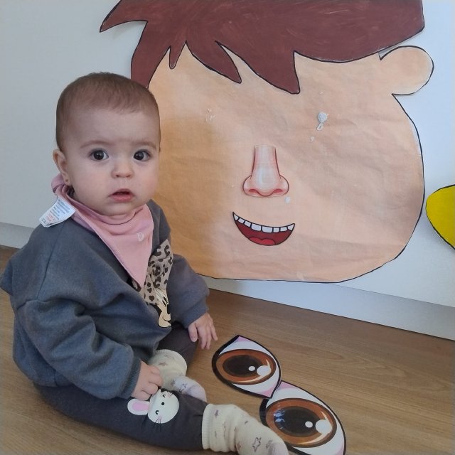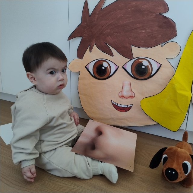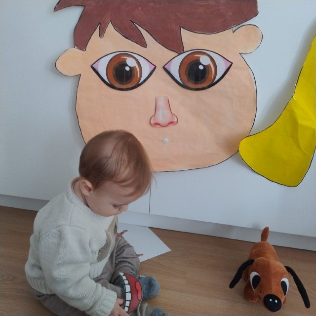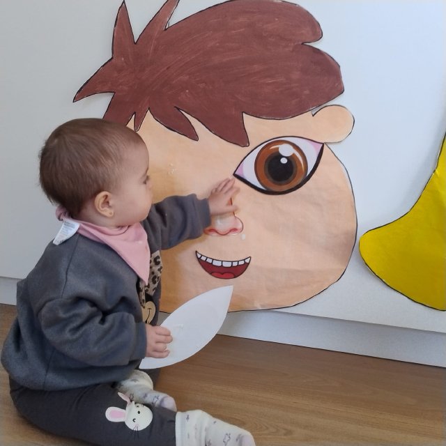Después, pasamos a una propuesta más creativa: un mural con diferentes caras en el que los niños debían colocar ojos, nariz y boca en su lugar. Esta actividad les permitió manipular, experimentar y explorar, mientras reforzaban de manera natural el conocimiento de las partes de la cara.