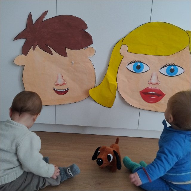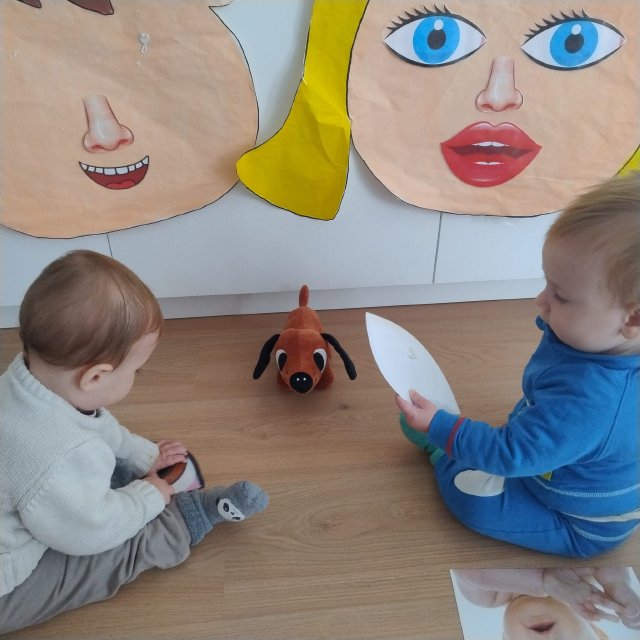 Primero, jugamos con el espejo, un recurso que siempre despierta curiosidad en los más pequeños. Cada niño pudo observar su carita, sus gestos y sus expresiones, descubriendo poco a poco que ese reflejo que ven… ¡son ellos mismos! Fue un momento lleno de sonrisas, miradas sorprendidas y pequeños toques al cristal.