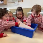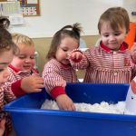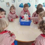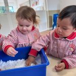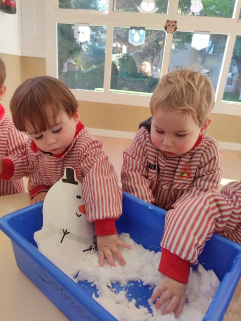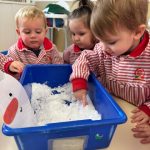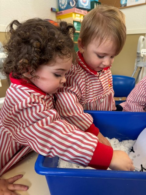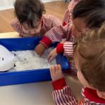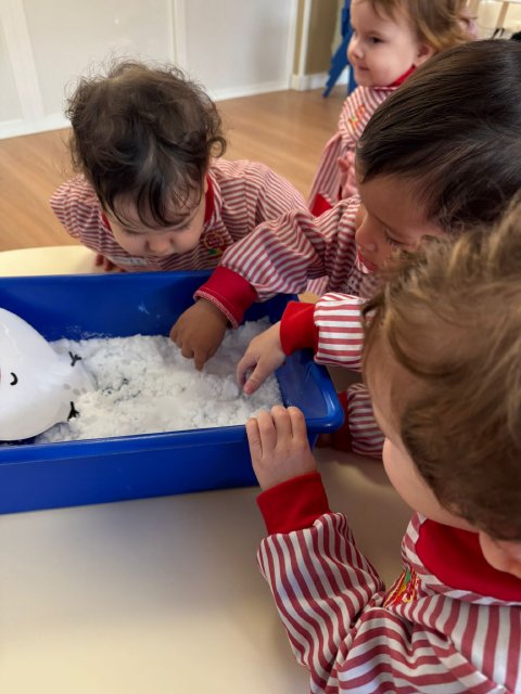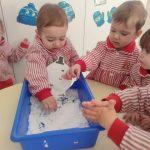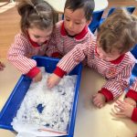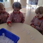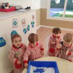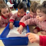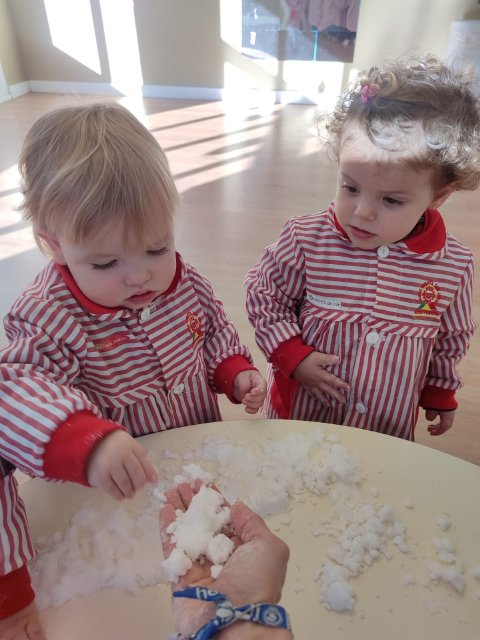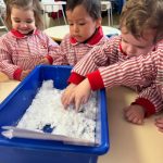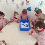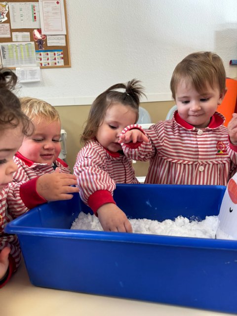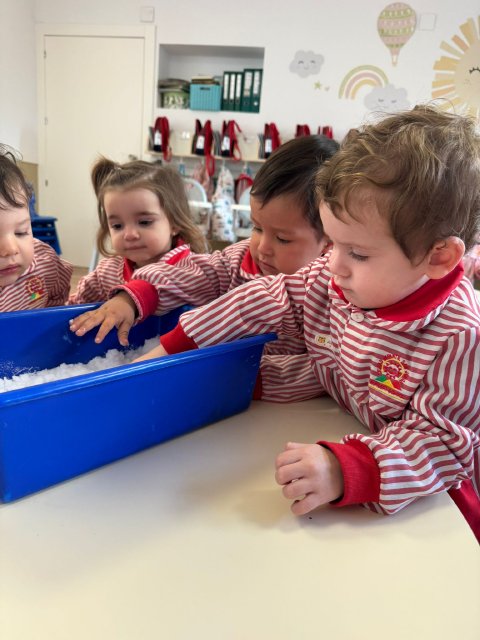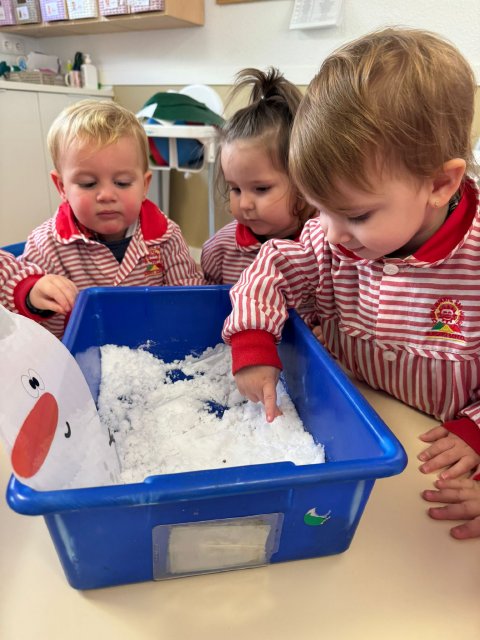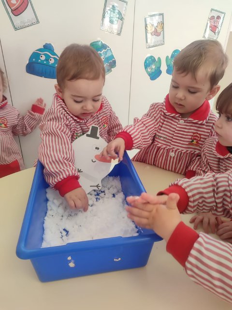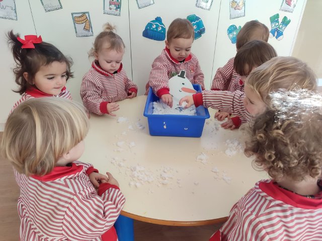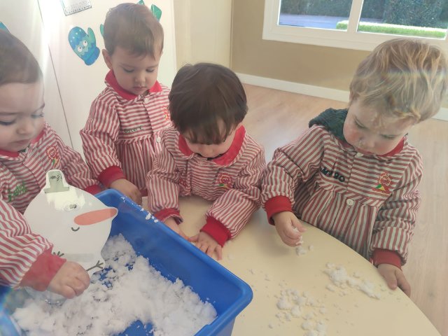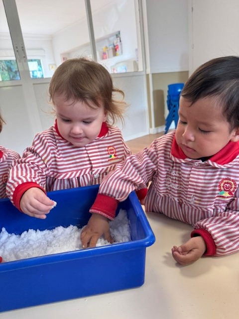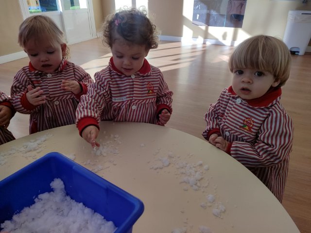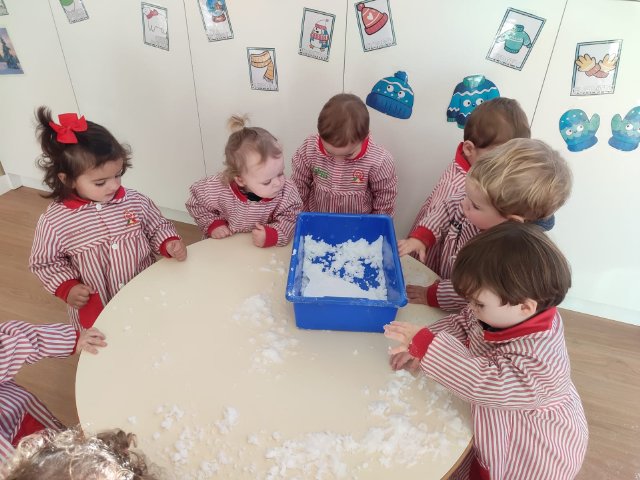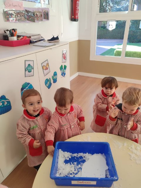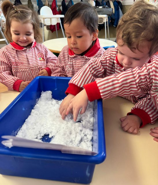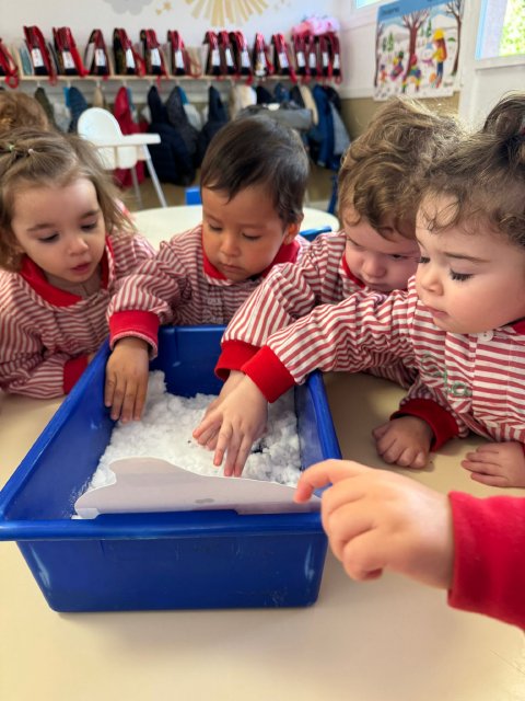 En el aula de Verde 1 hemos realizado una actividad sensorial con nieve artificial, elaborada con bicarbonato y agua fría, dentro de nuestra unidad didáctica del invierno. A través de la manipulación libre, los peques pudieron tocar, apretar, observar y experimentar nuevas sensaciones relacionadas con esta estación.