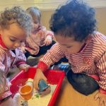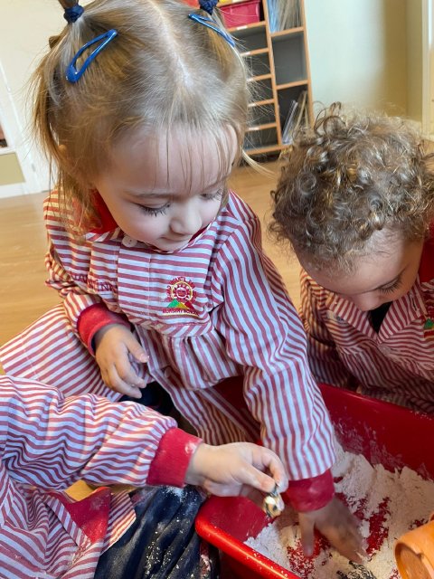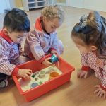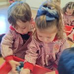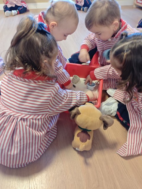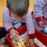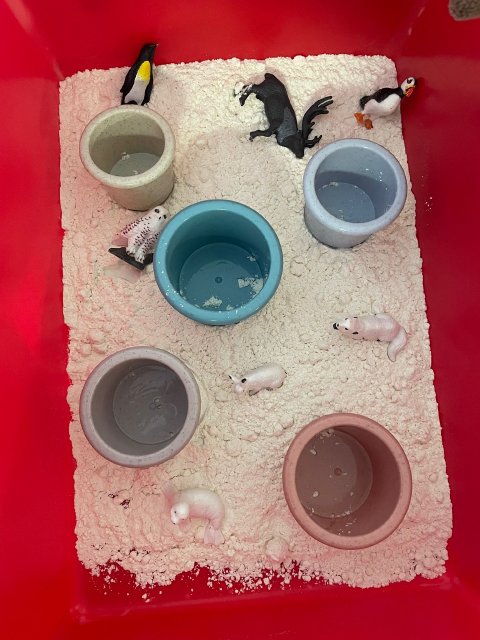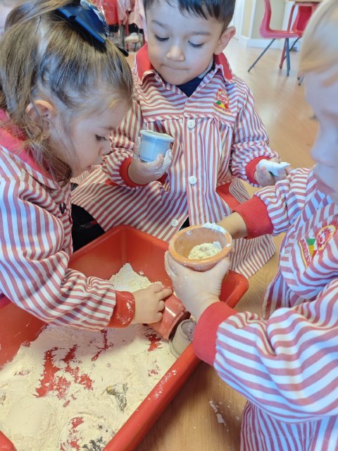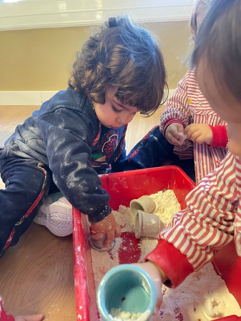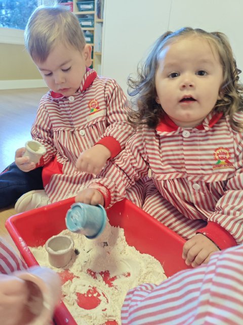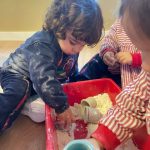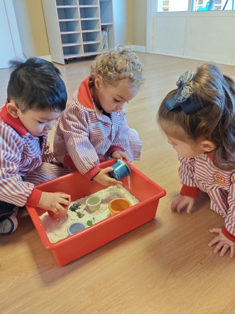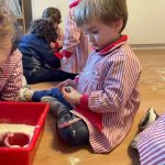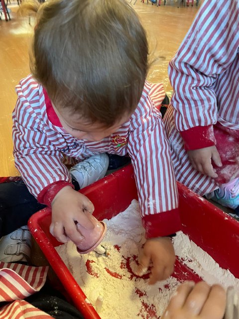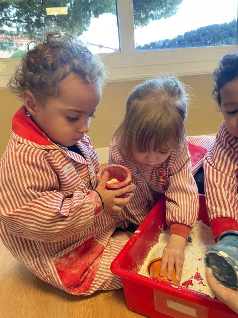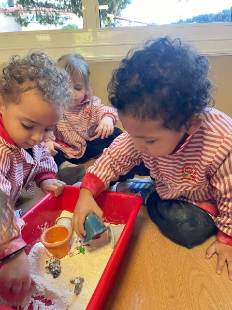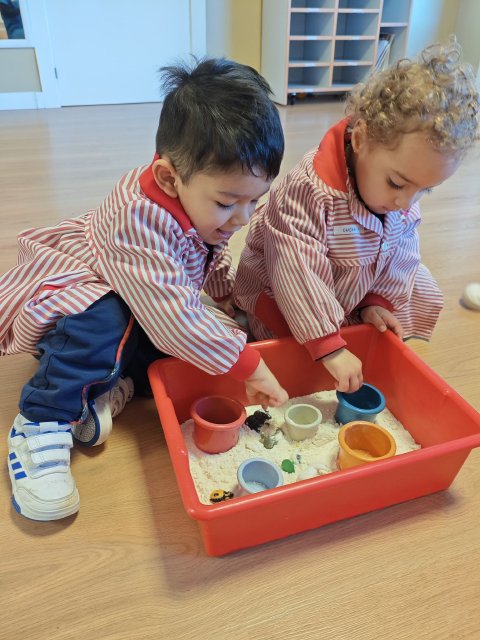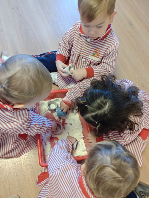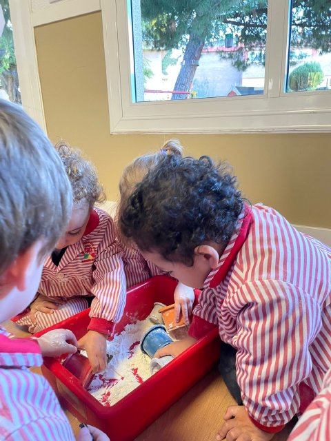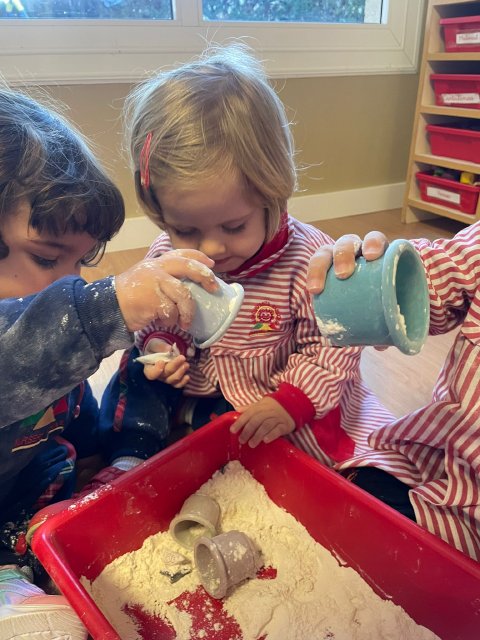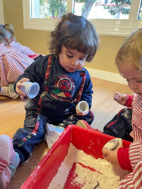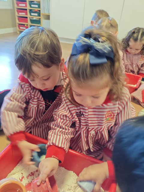 En el aula de Rojo 2 hemos realizado una actividad sensorial con harina, que permitió a los niños y niñas explorar a través del tacto y el juego libre. En recipientes llenos de harina, los peques buscaron y descubrieron pequeñas figuras, desarrollando la curiosidad, la atención y la coordinación.