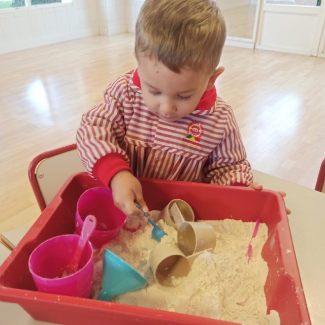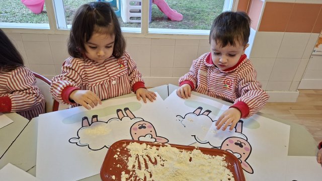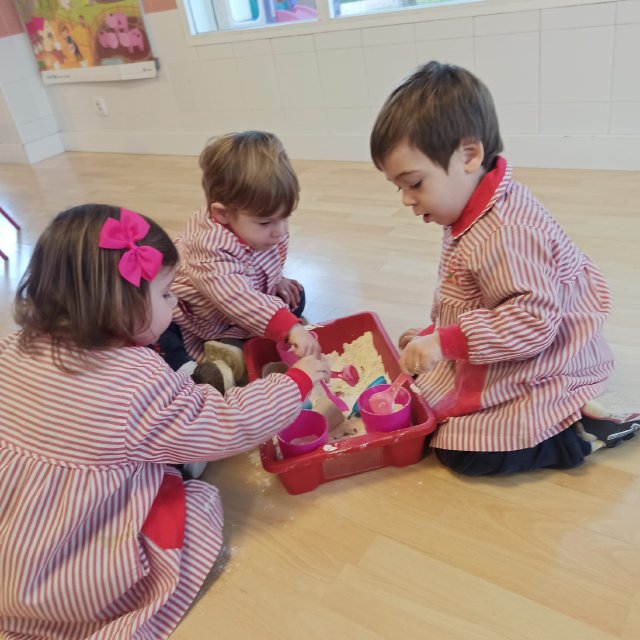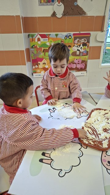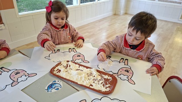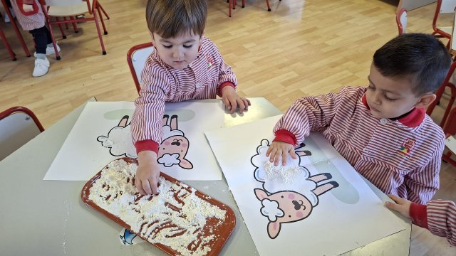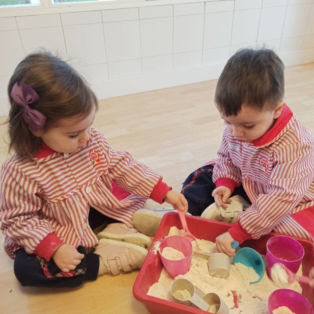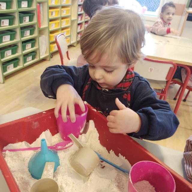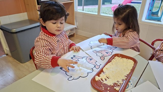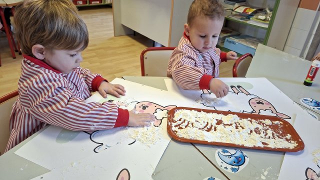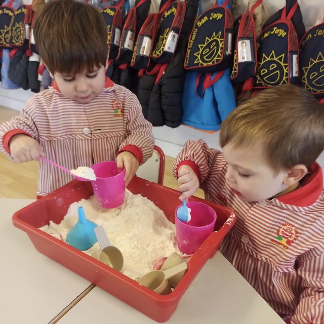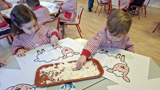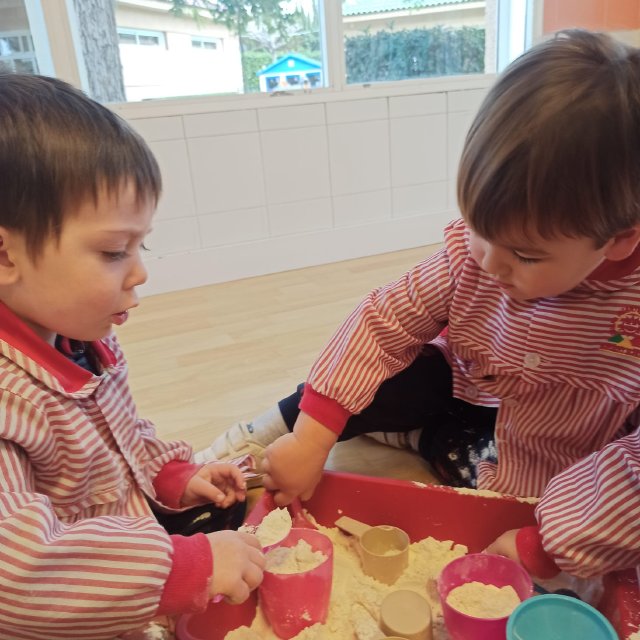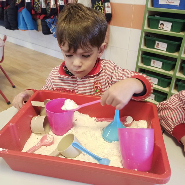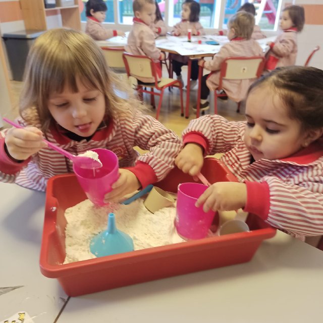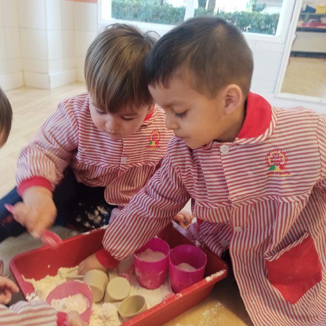 En el aula de Rojo 3 hemos realizado una actividad sensorial con harina, que permitió a los niños y niñas explorar a través del tacto y el juego libre. En recipientes llenos de harina, los peques buscaron y descubrieron pequeñas figuras, desarrollando la curiosidad, la atención y la coordinación.