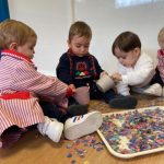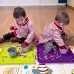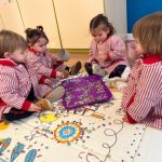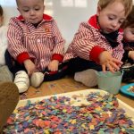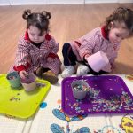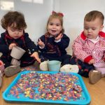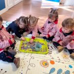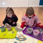 La actividad continuó con una experiencia de juego manipulativo con confeti de colores y vasos, donde pudieron llenar, vaciar, trasvasar y observar cómo caían los pequeños papeles. A través del juego libre fomentamos la experimentación, la atención y el disfrute, siempre respetando el ritmo de cada niño y niña.