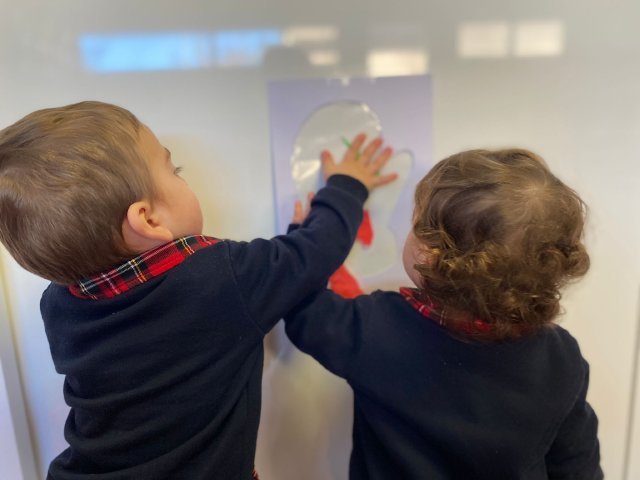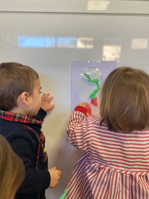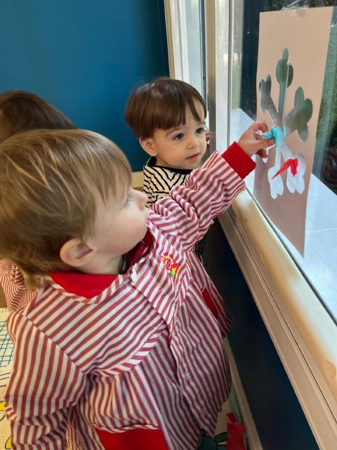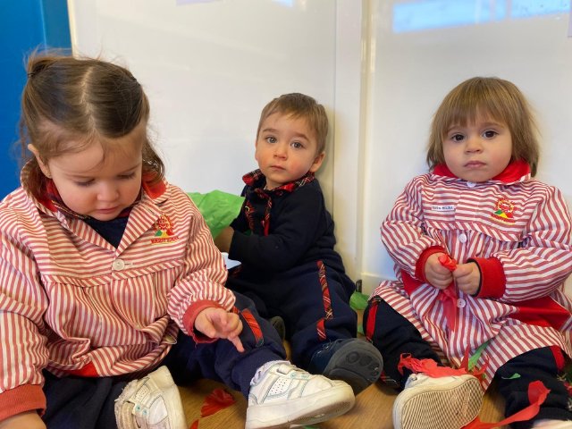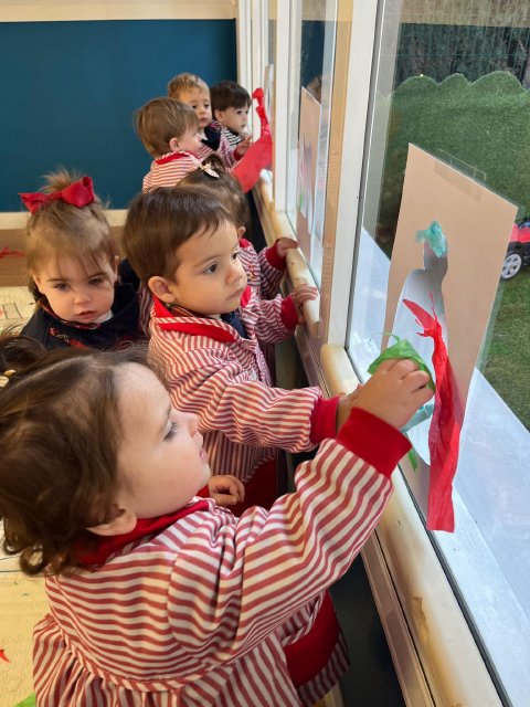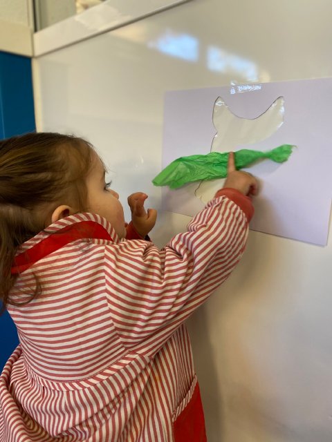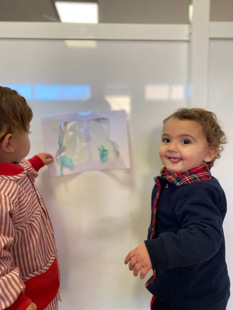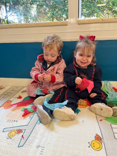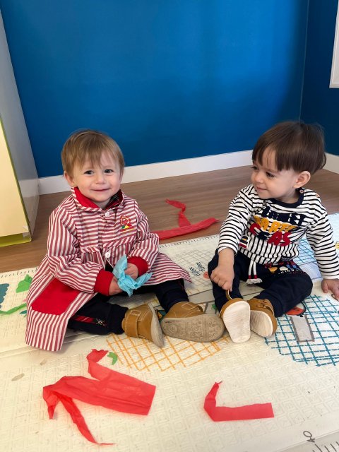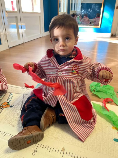 En Azul 3 hemos disfrutado de una actividad muy sensorial y creativa que despertó la curiosidad de los peques. Comenzamos trabajando el rasgado de papel de seda, una propuesta ideal para fortalecer la motricidad fina y la coordinación ojo-mano. Los niños y niñas rasgaron libremente el papel y después lo pegaron sobre figuras previamente recortadas en papel adhesivo, explorando texturas, colores y formas de manera autónoma y divertida.
