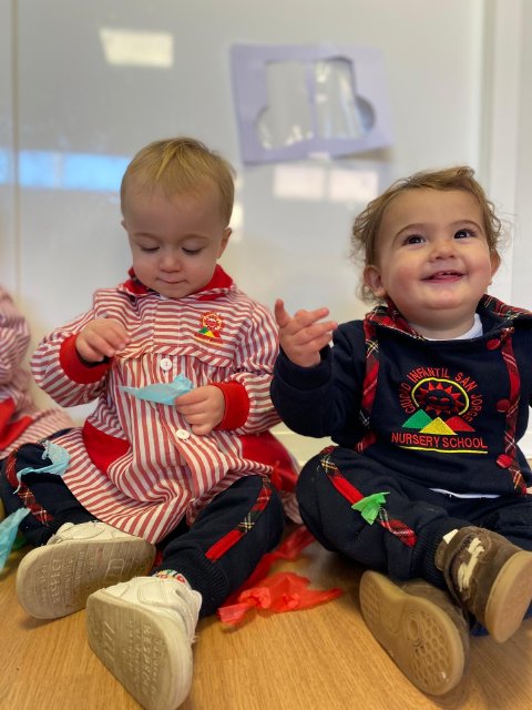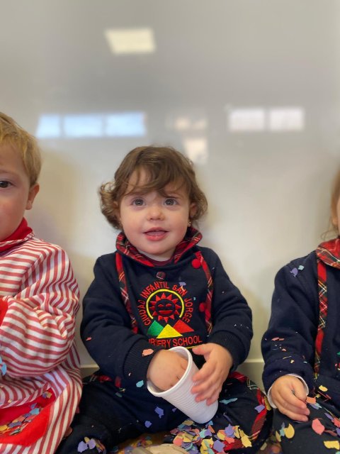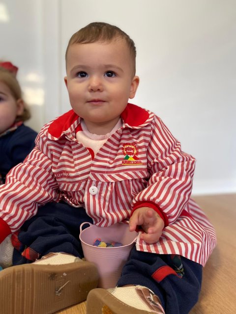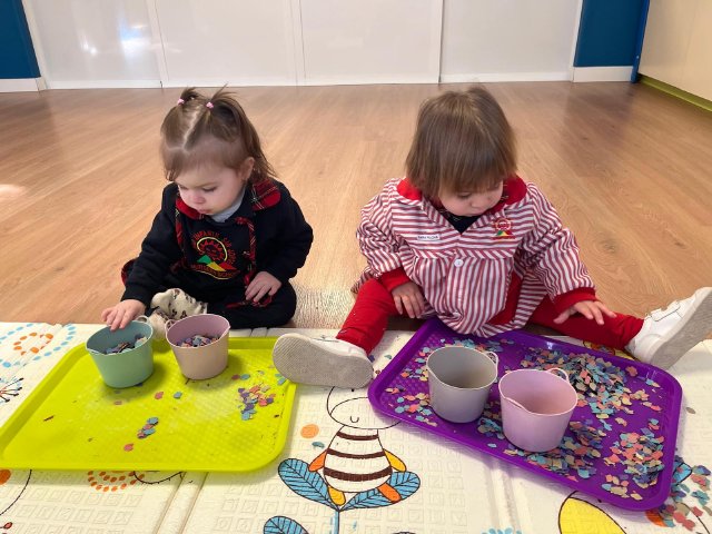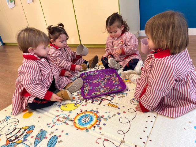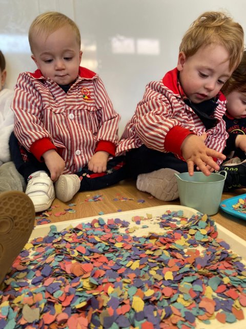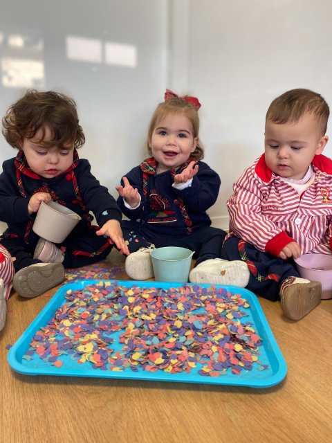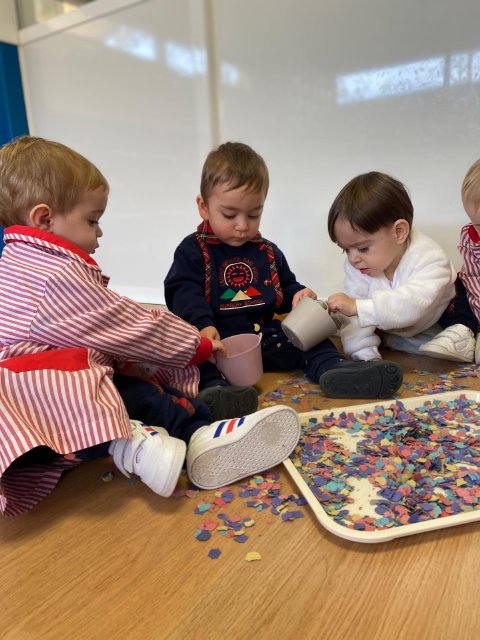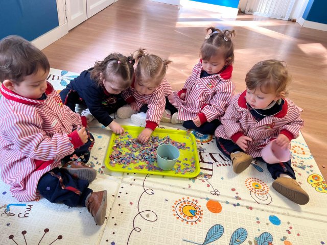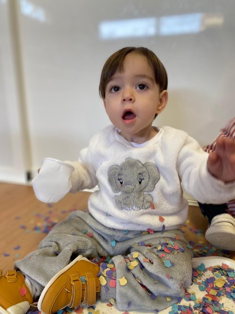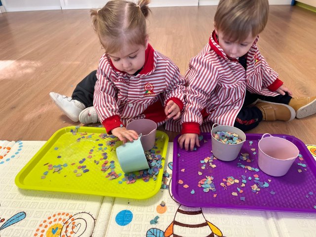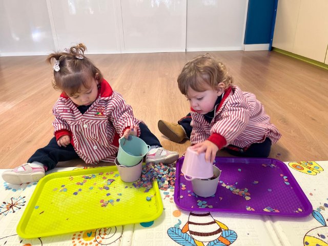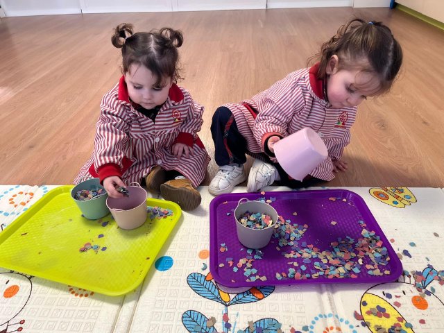 La actividad continuó con una experiencia de juego manipulativo con confeti de colores y vasos, donde pudieron llenar, vaciar, trasvasar y observar cómo caían los pequeños papeles. A través del juego libre fomentamos la experimentación, la atención y el disfrute, siempre respetando el ritmo de cada niño y niña.