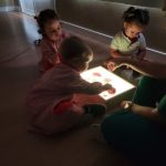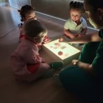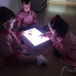 En la mesa de luz, exploraron materiales translúcidos y opacos, experimentando con los contrastes, las formas y los colores. Una actividad que estimula la curiosidad, la atención y la observación.