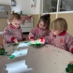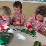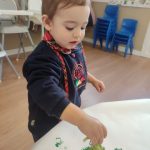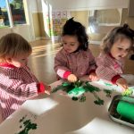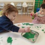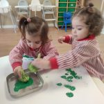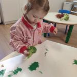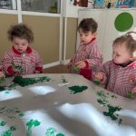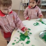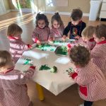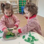 Para terminar, hemos aprendido el color verde mediante una actividad plástica, estampando con esponjas y pintura témpera líquida, experimentando con el color, la textura y el placer de crear con sus propias manos.