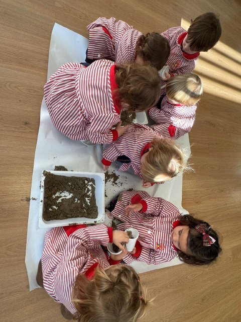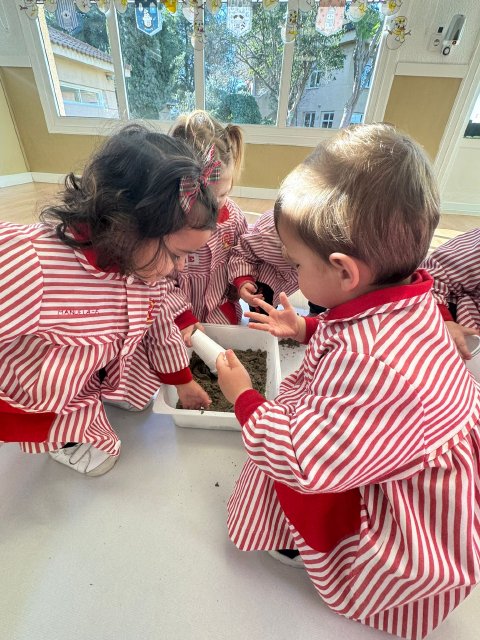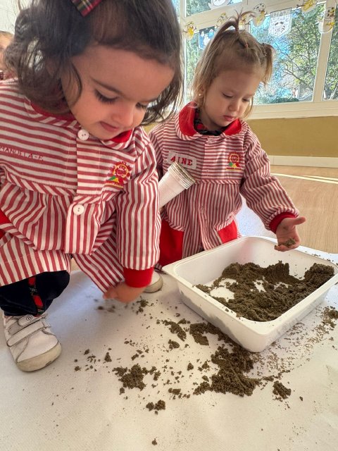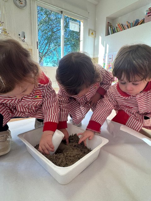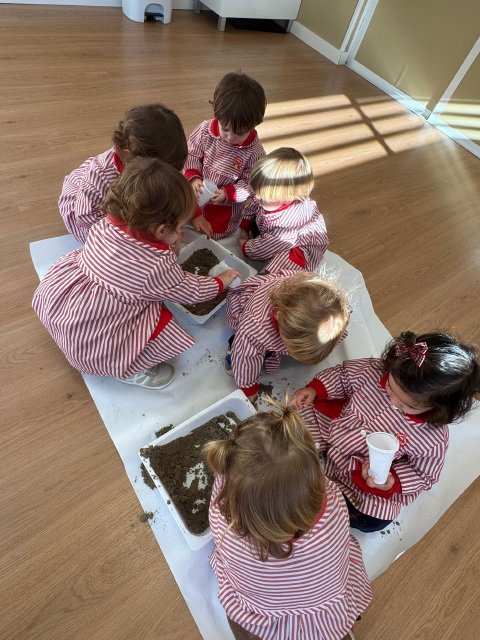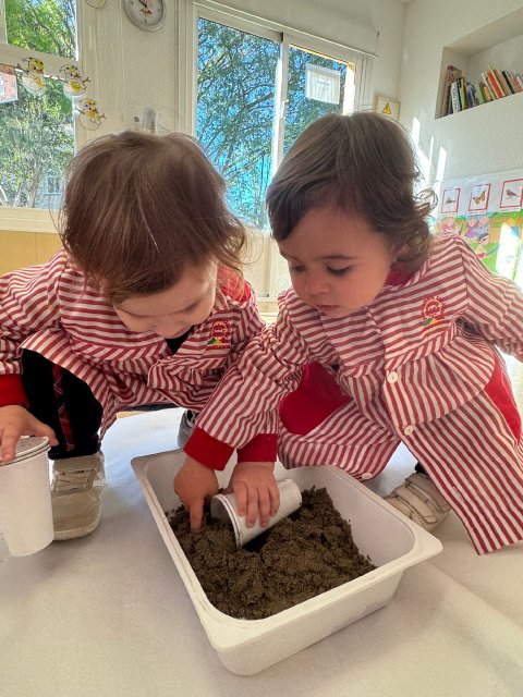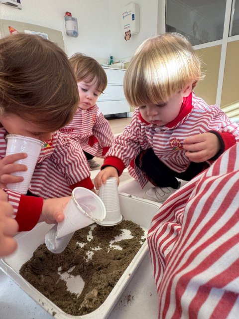 Comenzamos con actividades con arena, realizando trasvases con palas y vasos, una propuesta que favorece la coordinación, la concentración y la motricidad fina a través de la manipulación libre.