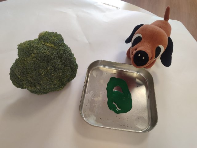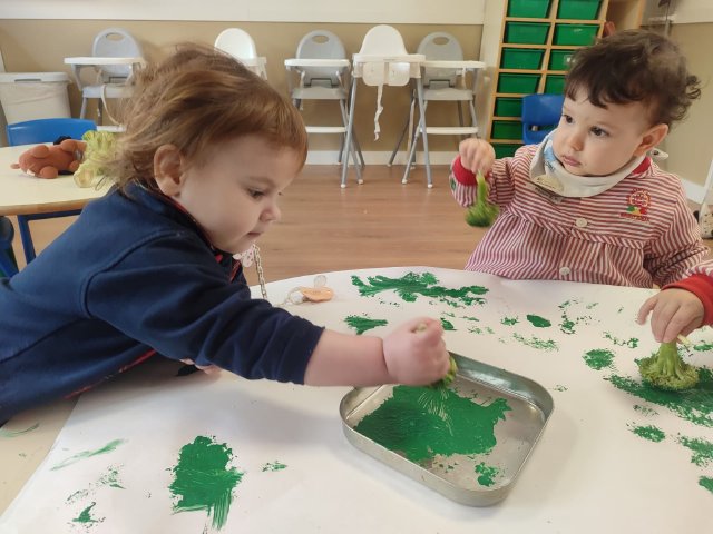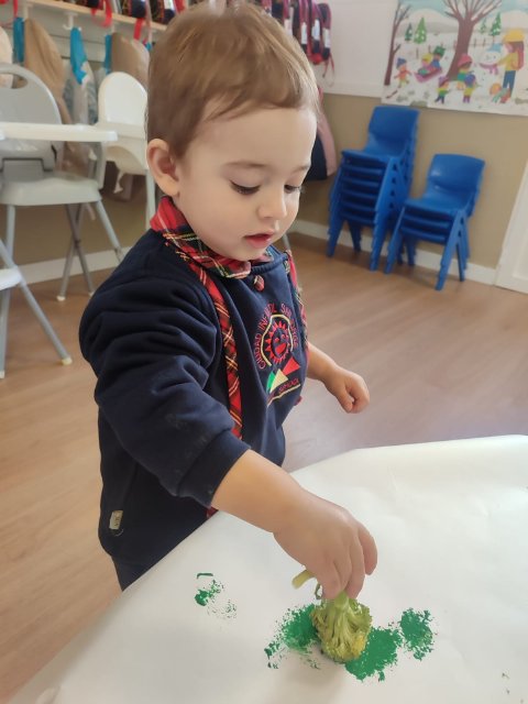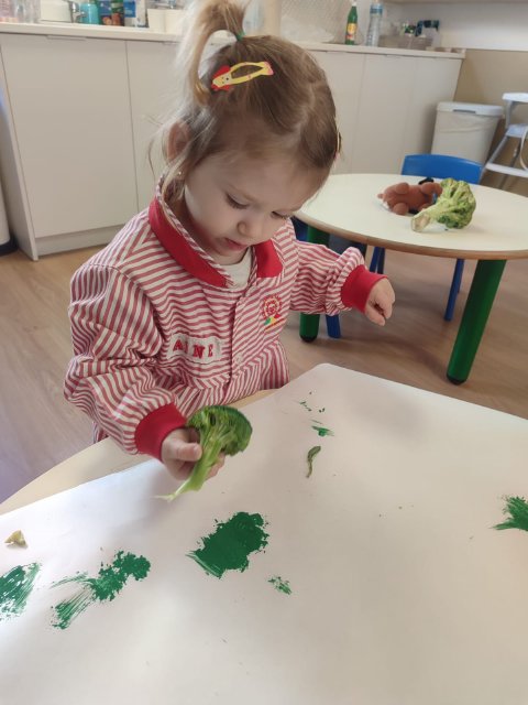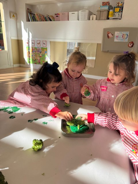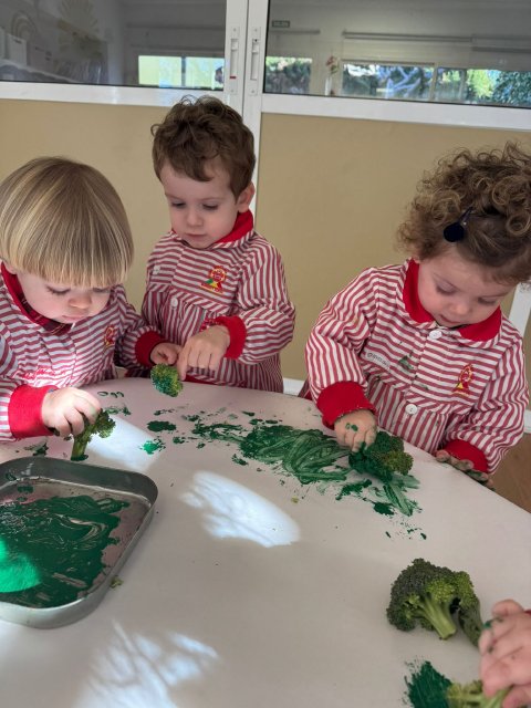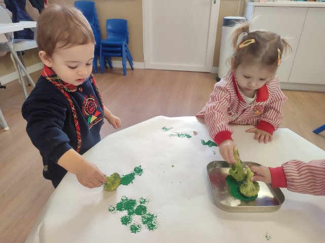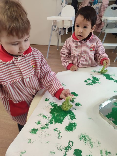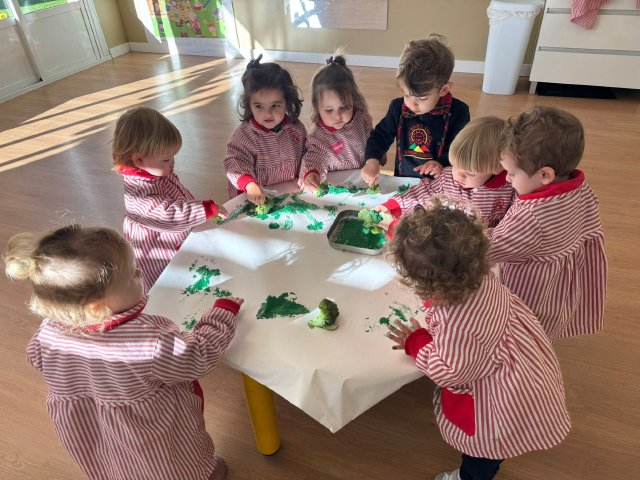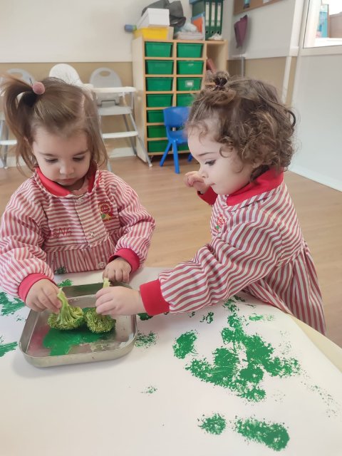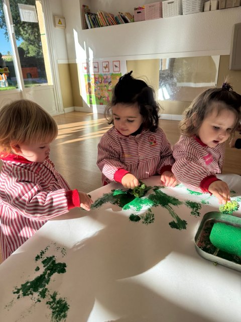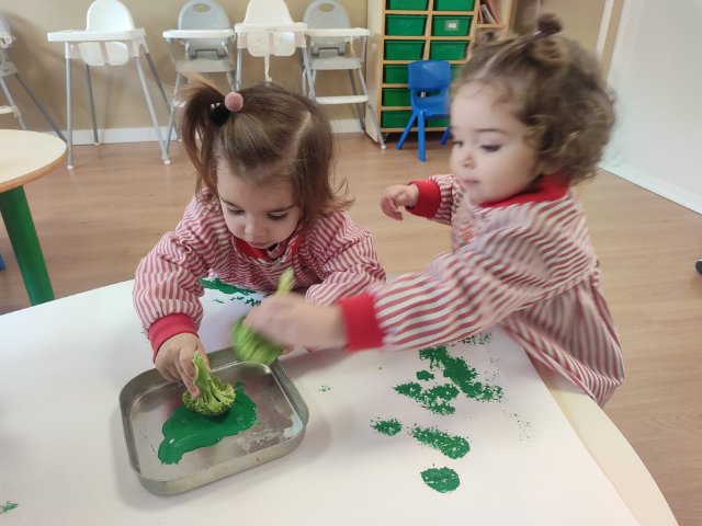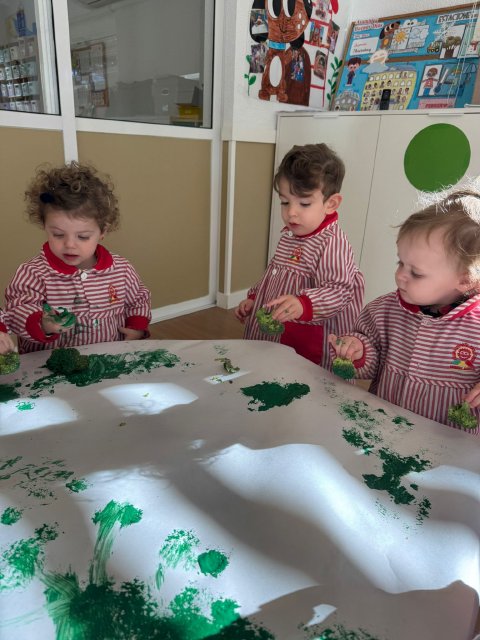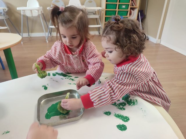 Para terminar, hemos aprendido el color verde mediante una actividad plástica, estampando con esponjas y pintura témpera líquida, experimentando con el color, la textura y el placer de crear con sus propias manos.