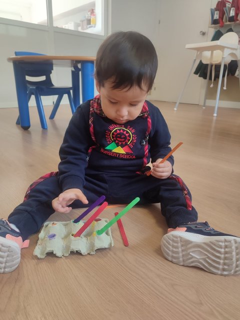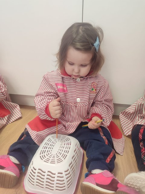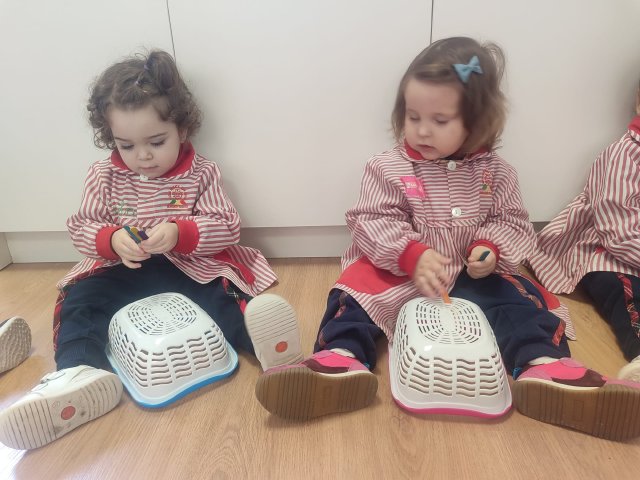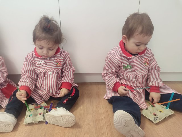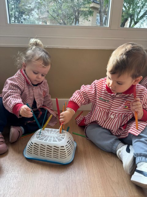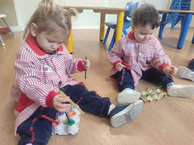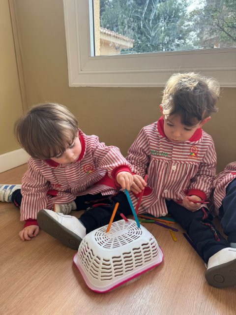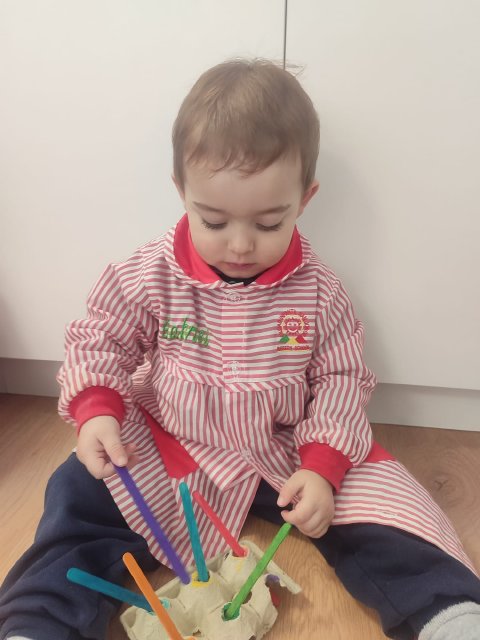 En Verde 1 hemos realizado una actividad manipulativa de ensartar palos de madera pintados de colores en cajas con ranuras, una propuesta sencilla que favorece el aprendizaje a través de la acción y la experimentación.