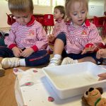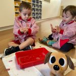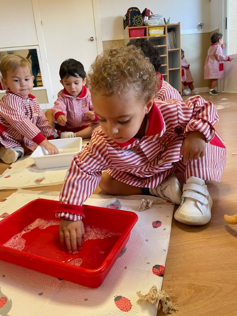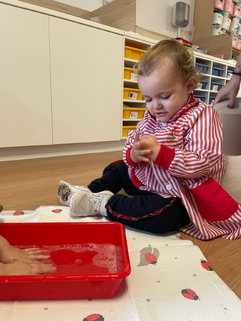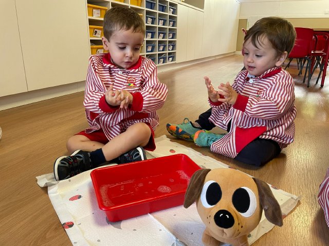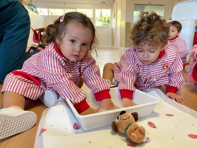 Por un lado, han participado en un juego simbólico de aseo personal, donde han lavado a los bebés de juguete con esponjas, toallas, agua y jabón.
