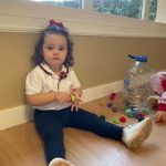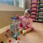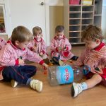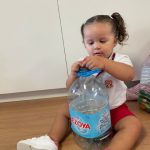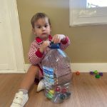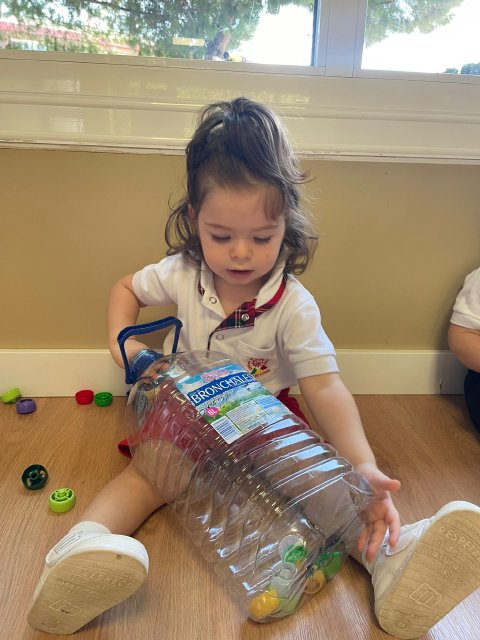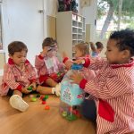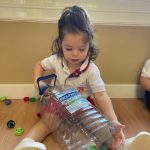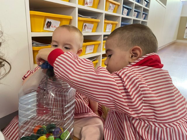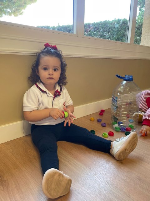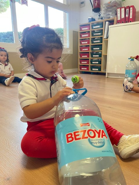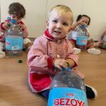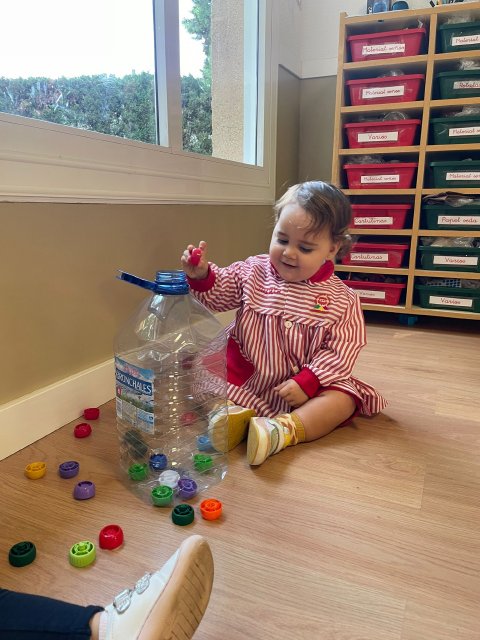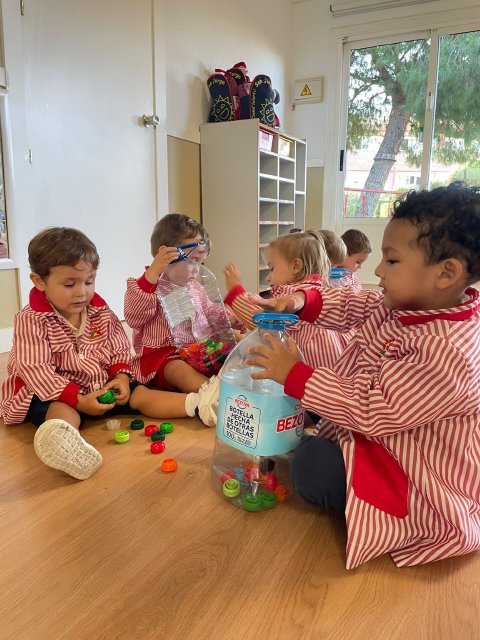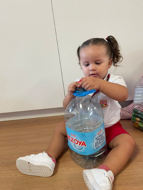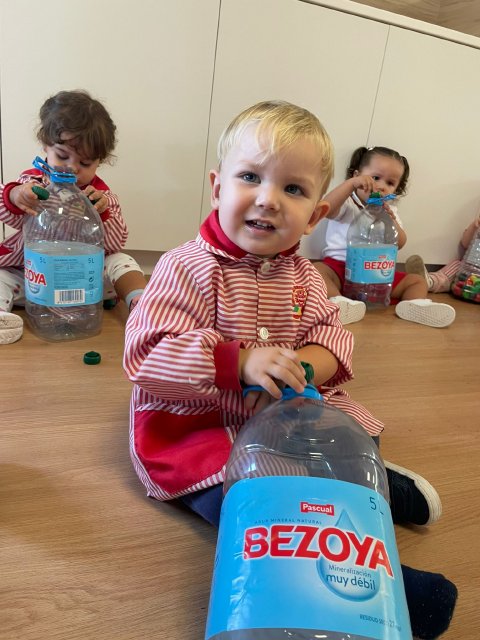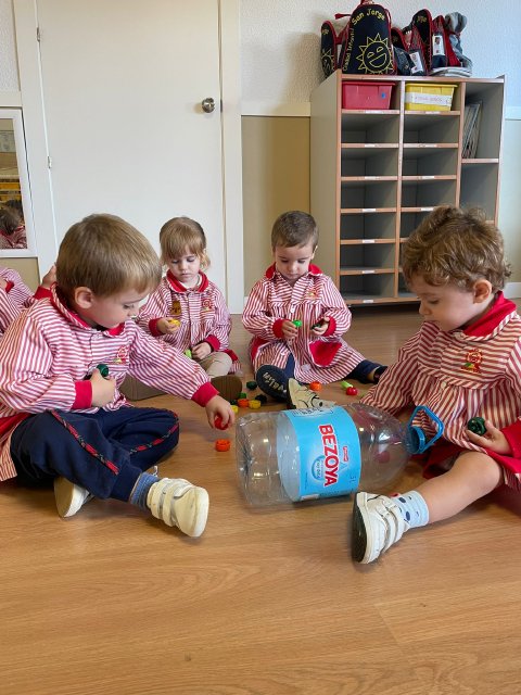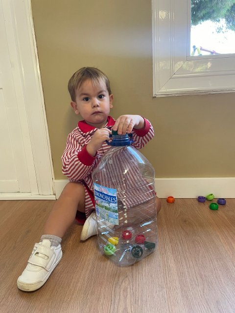 Después, se han divertido con un juego de motricidad fina, introduciendo tapones en garrafas de agua vacías.