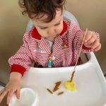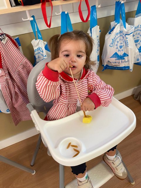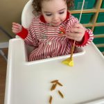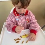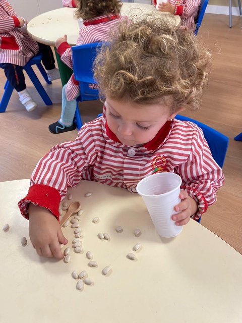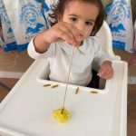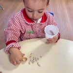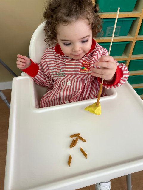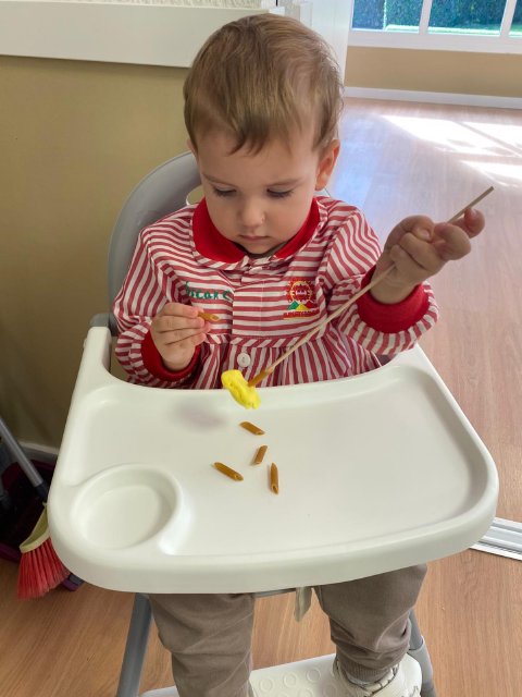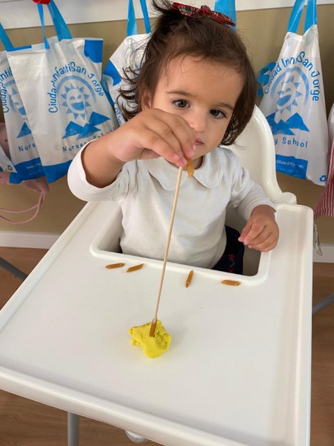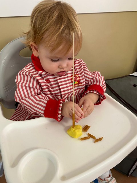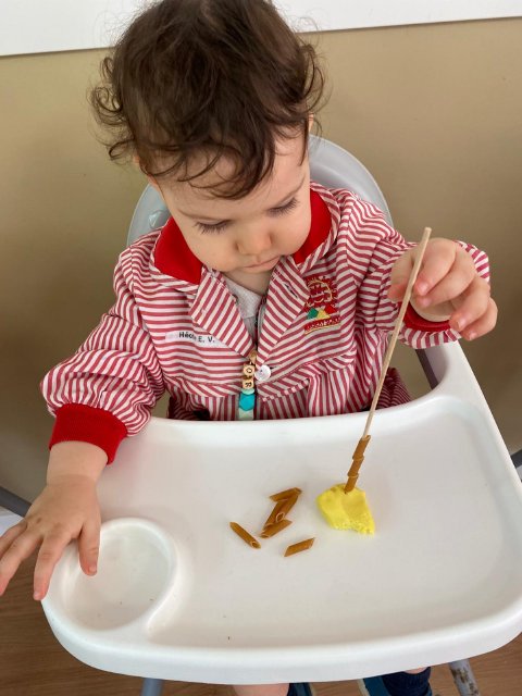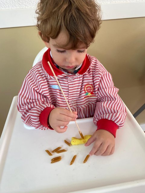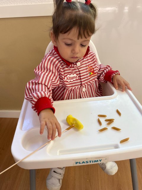 Primero, los niños y niñas clavaron un espagueti en una bolita de plastilina, y después fueron ensartando los macarrones con cuidado, concentrándose en no romperlo.