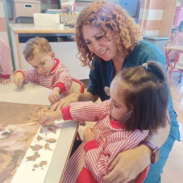 El aula se ha llenado de hojas secas, piñas, ramas y frutos naturales, que se han convertido en verdaderos tesoros para explorar, tocar y descubrir.