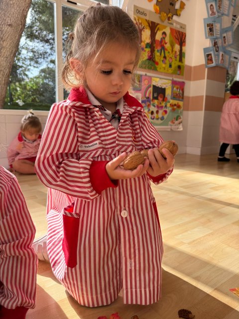 El aula se ha llenado de hojas secas, piñas, ramas y frutos naturales, que se han convertido en verdaderos tesoros para explorar, tocar y descubrir.