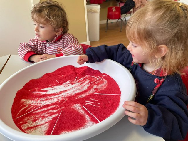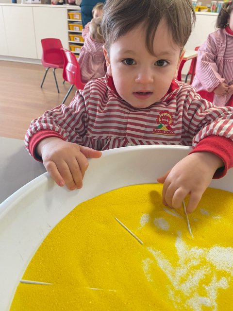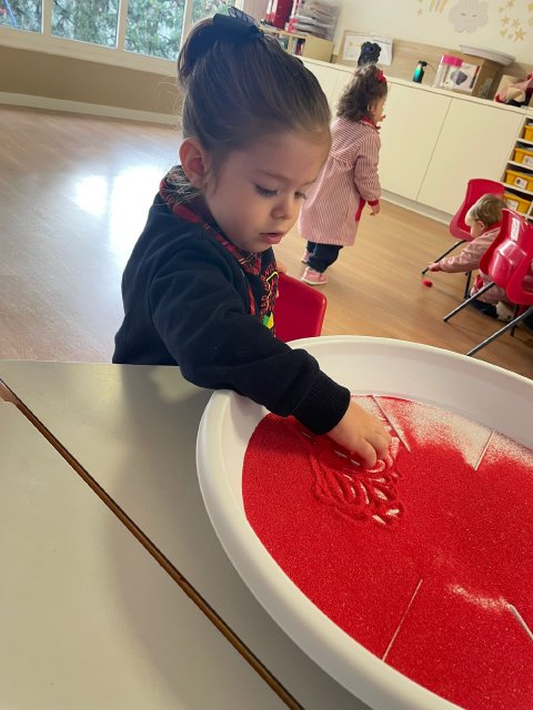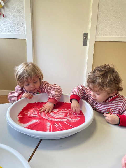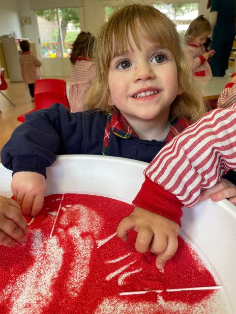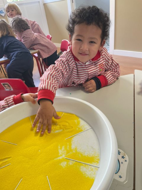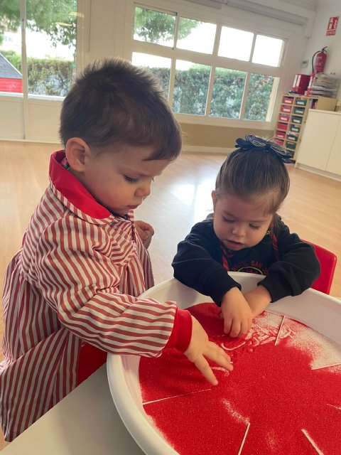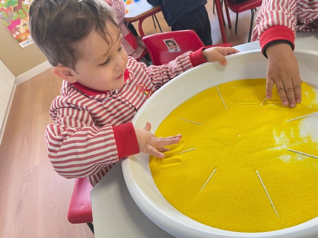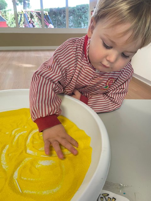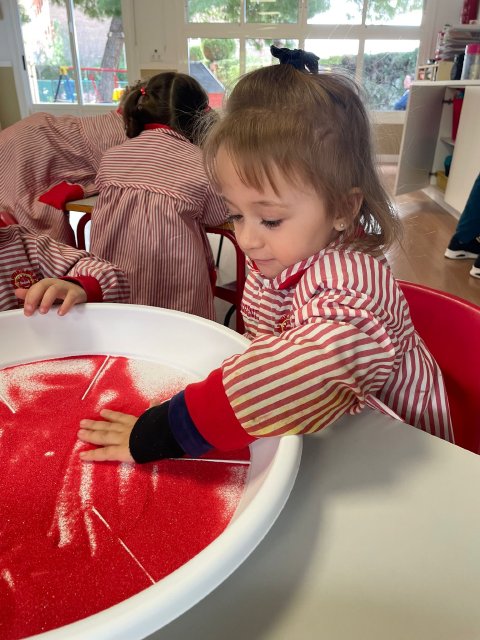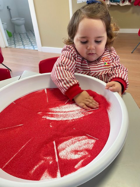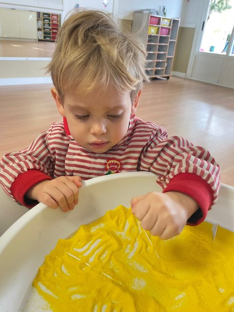 Los niños y niñas han manipulado la arena, experimentando con diferentes texturas, mezclas de colores y formas, lo que favorece la motricidad fina, la concentración y la percepción sensorial. Además, explorar los colores y las combinaciones permite reforzar conceptos como el reconocimiento cromático y la coordinación ojo-mano.