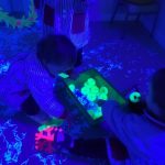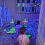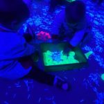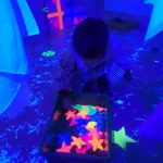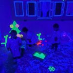 Comenzamos explorando la sala de luz negra, un espacio que siempre despierta sorpresa y admiración. Los materiales fluorescentes brillaban en la oscuridad y los niños pudieron manipularlos, observar sus cambios y descubrir un mundo lleno de luz y color que se transforma ante sus ojos.