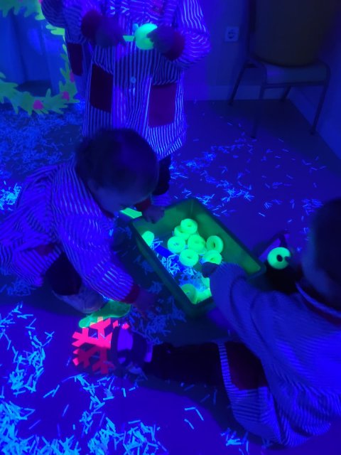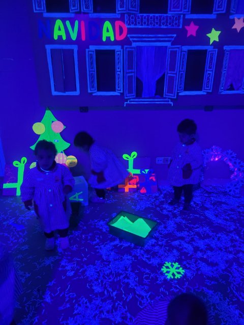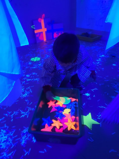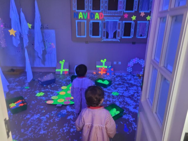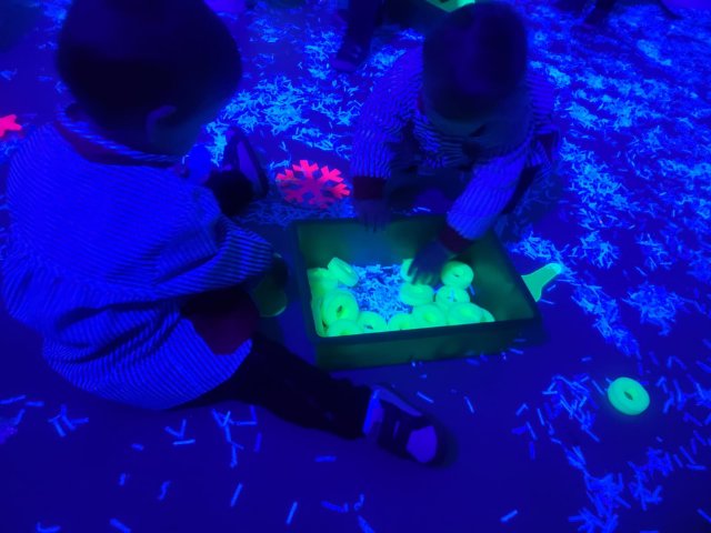 Comenzamos explorando la sala de luz negra, un espacio que siempre despierta sorpresa y admiración. Los materiales fluorescentes brillaban en la oscuridad y los niños pudieron manipularlos, observar sus cambios y descubrir un mundo lleno de luz y color que se transforma ante sus ojos.