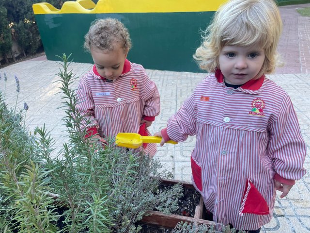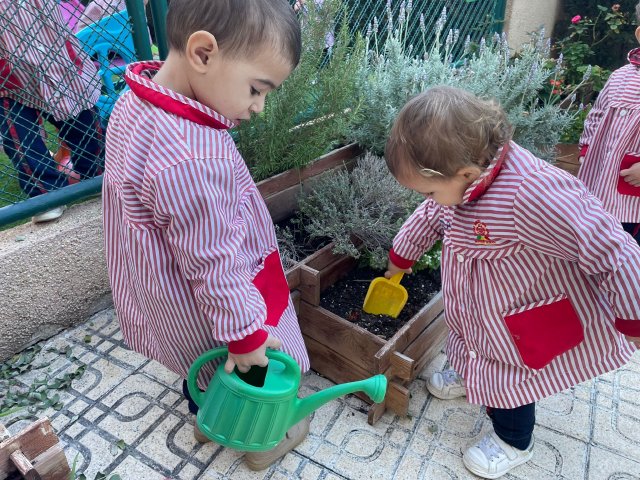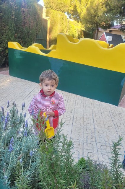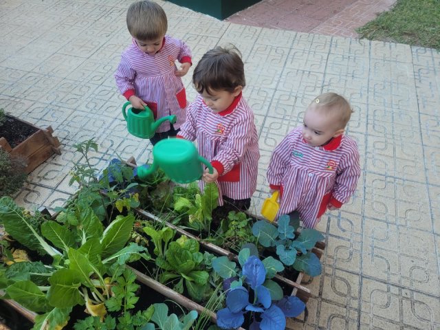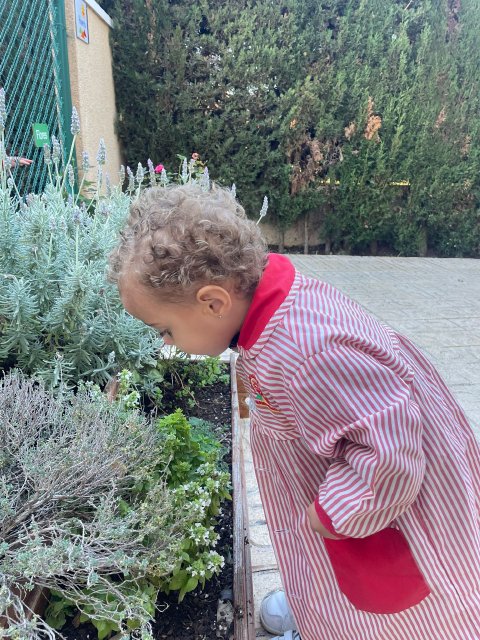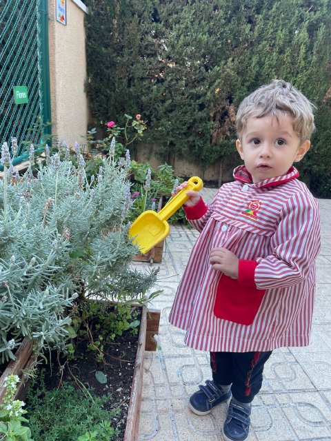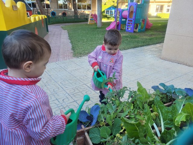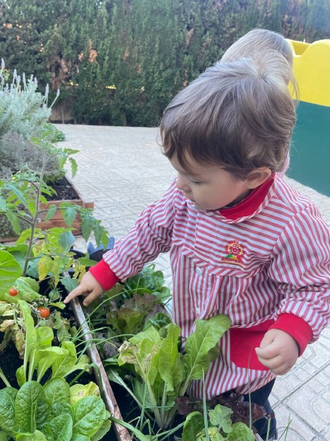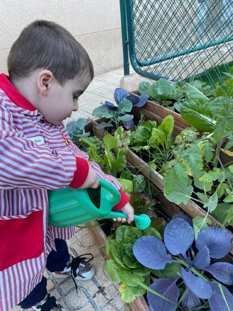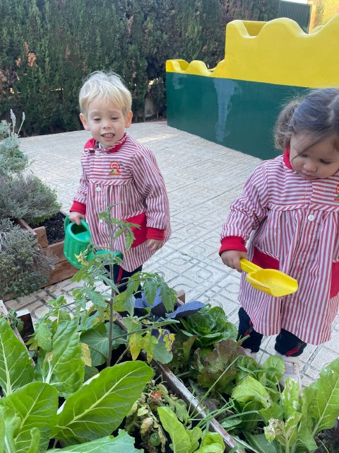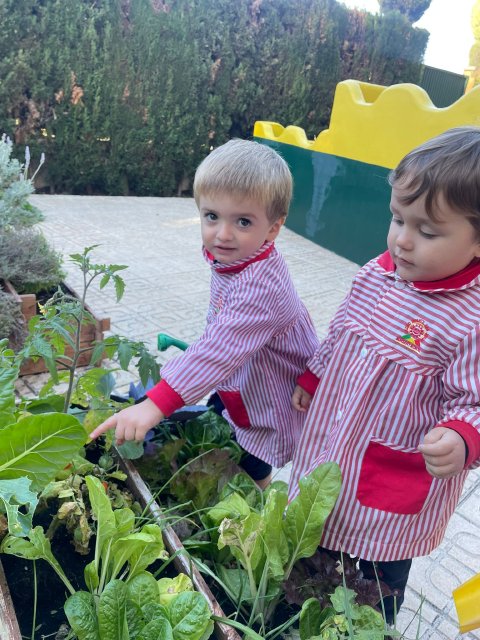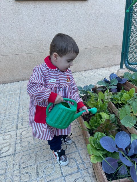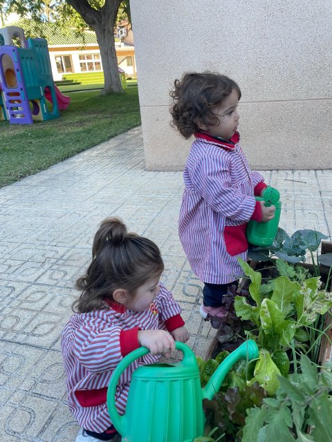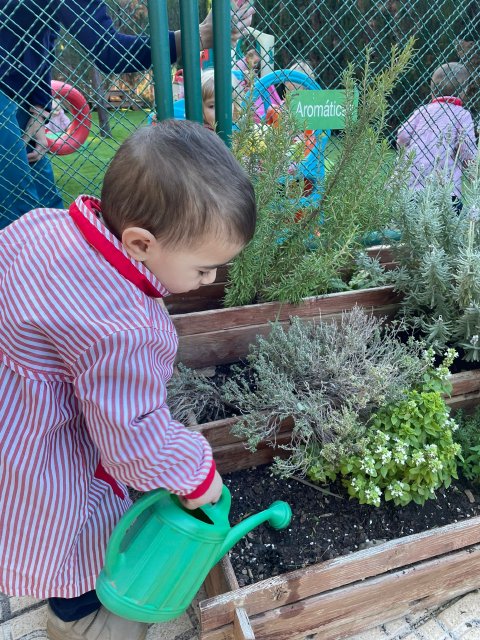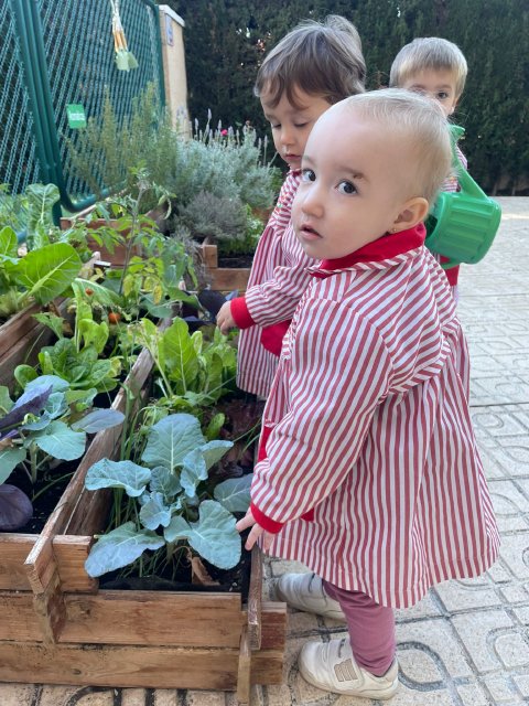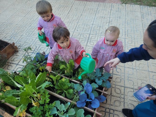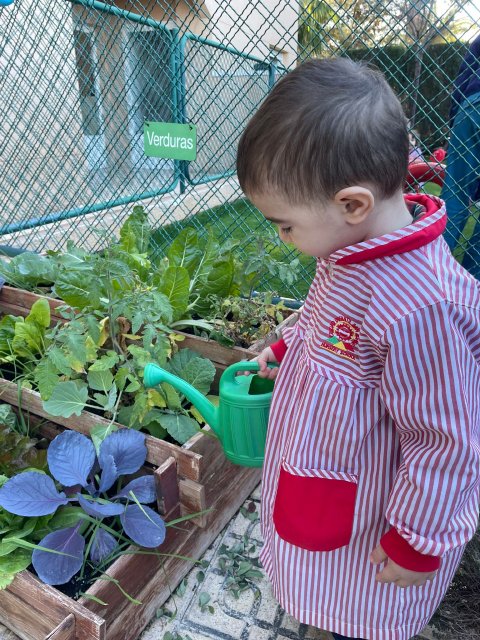 Más tarde salimos al exterior para dedicar un ratito al cuidado de nuestro huerto. Regar, tocar la tierra, observar las plantas y ver cómo crecen les ayuda a comprender procesos naturales sencillos y a desarrollar actitudes de cuidado y respeto hacia la naturaleza. Cada pequeño avance en el huerto es vivido por ellos con ilusión.