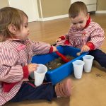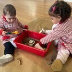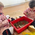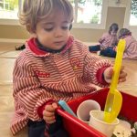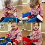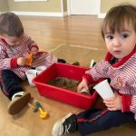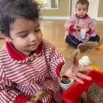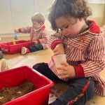 Por un lado, hemos realizado una actividad con arena, utilizando palas y vasos para hacer trasvases, llenando y vaciando recipientes y observando cómo la arena cambia de un lugar a otro. Esta propuesta favorece la coordinación, la concentración y la motricidad fina.