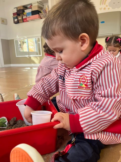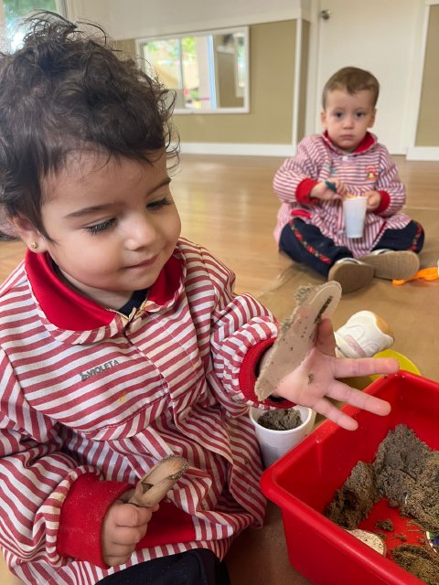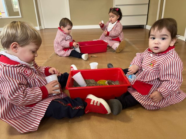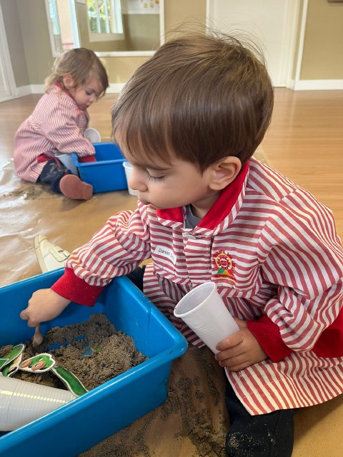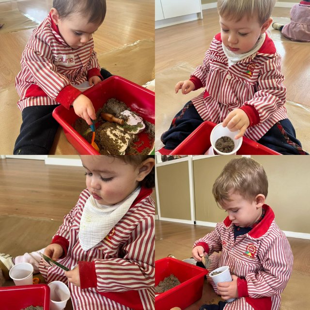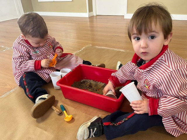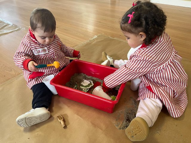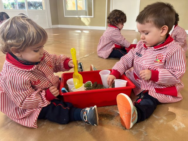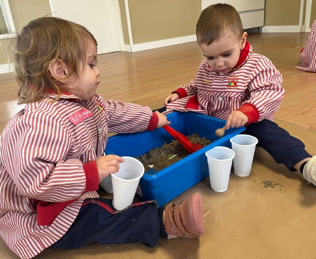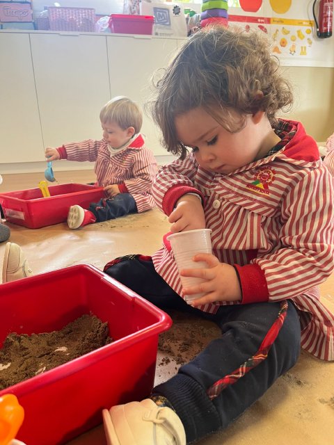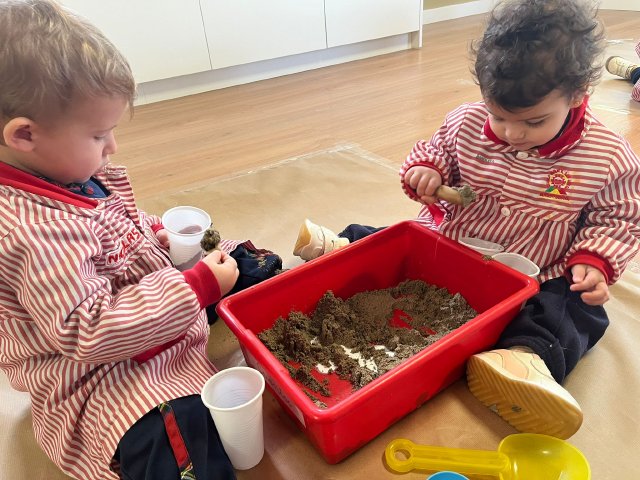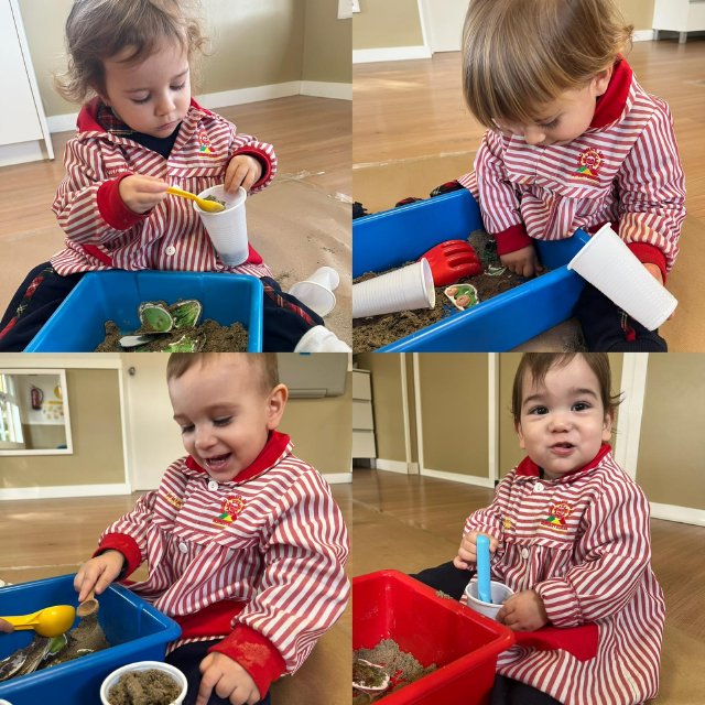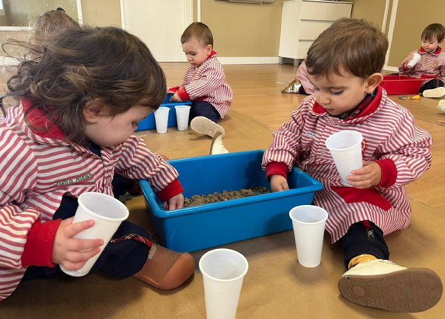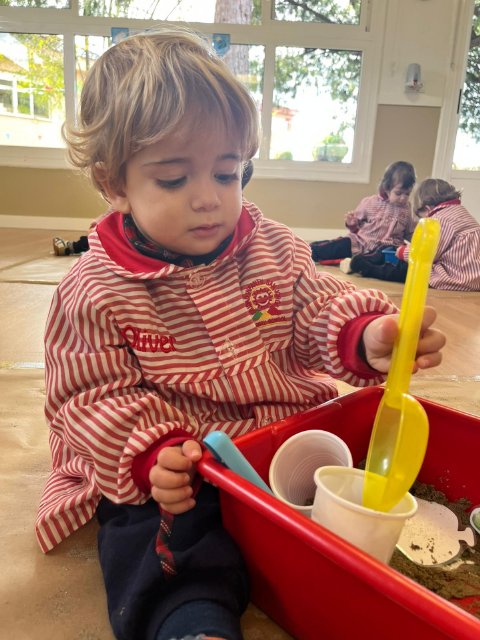 Por un lado, hemos realizado una actividad con arena, utilizando palas y vasos para hacer trasvases, llenando y vaciando recipientes y observando cómo la arena cambia de un lugar a otro. Esta propuesta favorece la coordinación, la concentración y la motricidad fina.