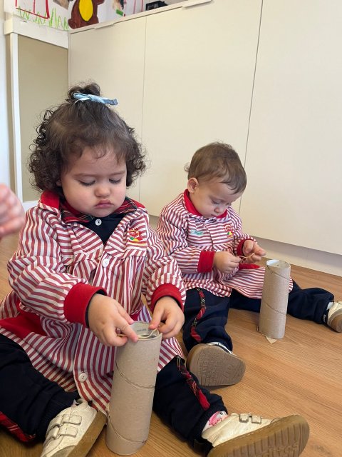 Además, hemos trabajado con tubos de cartón, en los que los peques han tenido que enganchar gomas elásticas alrededor del tubo. Una actividad que estimula la fuerza en los dedos, la precisión, la atención y la exploración de nuevas texturas de forma segura y divertida.