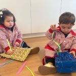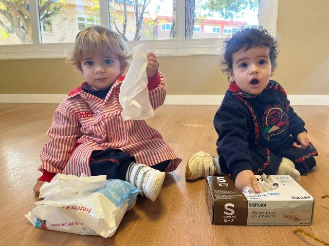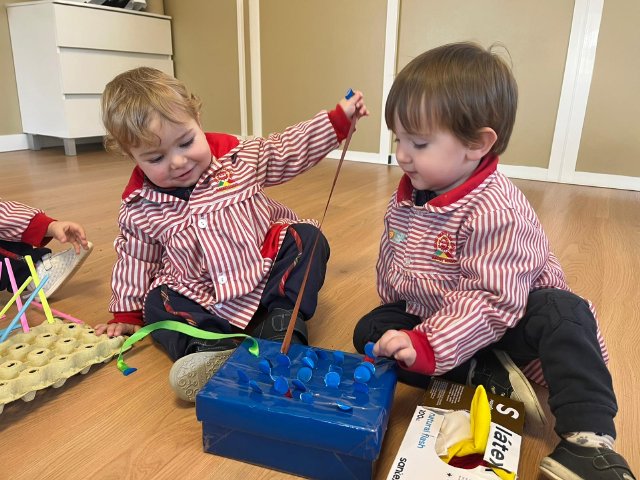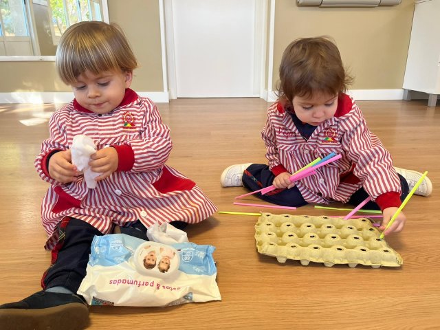 Dentro del aula, hemos propuesto un divertido reto de motricidad fina: coger, estirar y sacar objetos. Palitos escondidos en cajas, toallitas para sacar de un paquete, cintas de colores que aparecen una tras otra… actividades sencillas que despiertan la curiosidad y ayudan a mejorar la coordinación mano-ojo.
