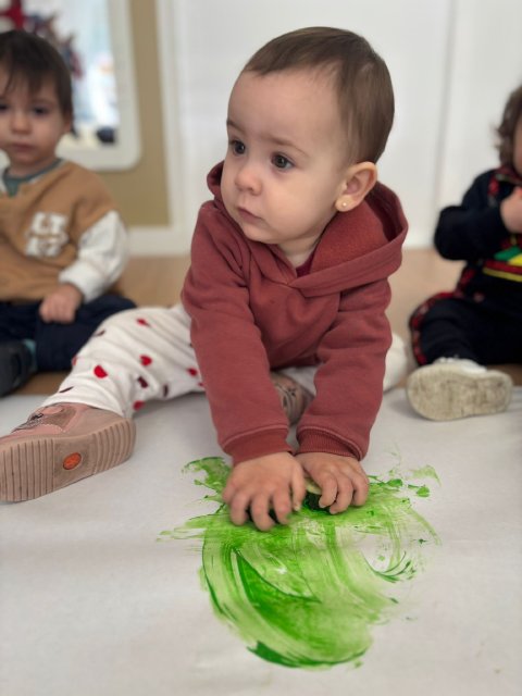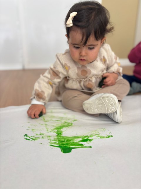 Con ayuda de las seños, los peques han tocado la pintura, observado cómo se extendía sobre el papel y experimentado con sus manos, dejando huellas y marcas libres. El objetivo no era el resultado, sino sentir, explorar y experimentar.