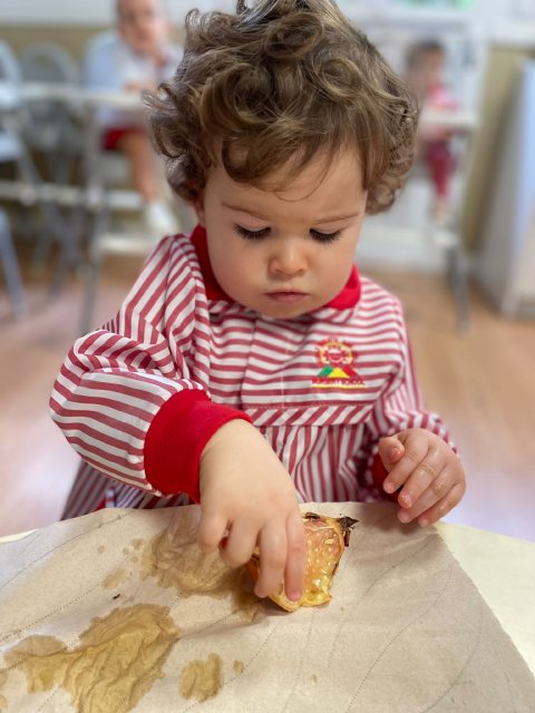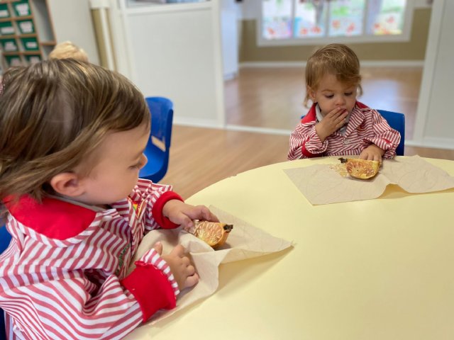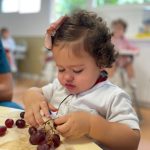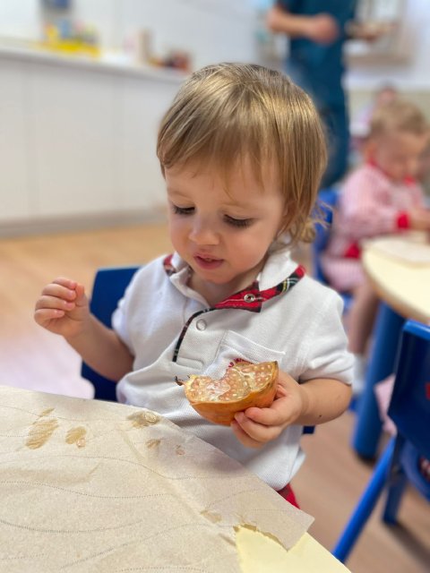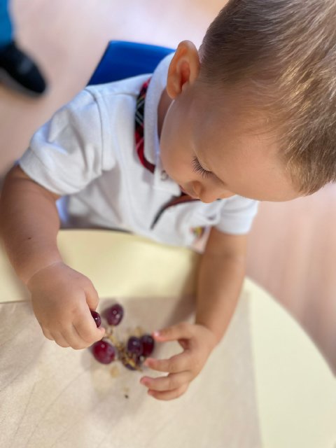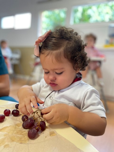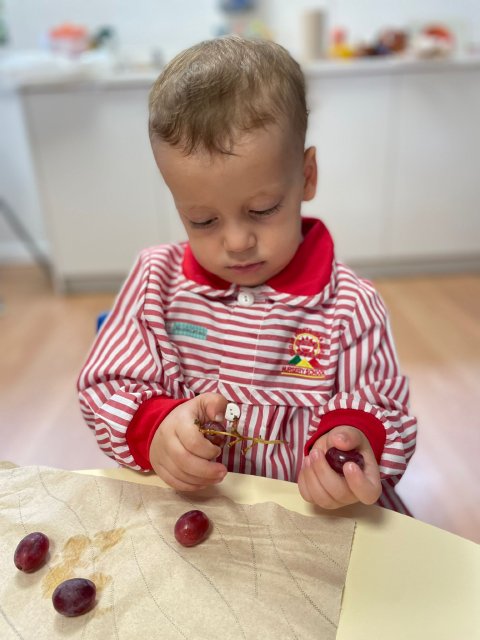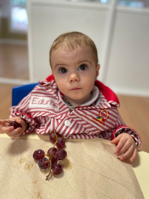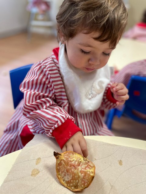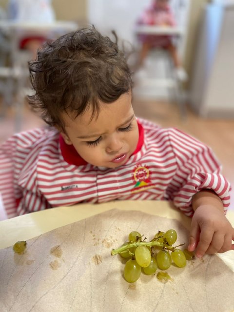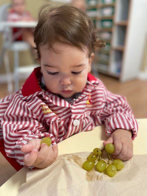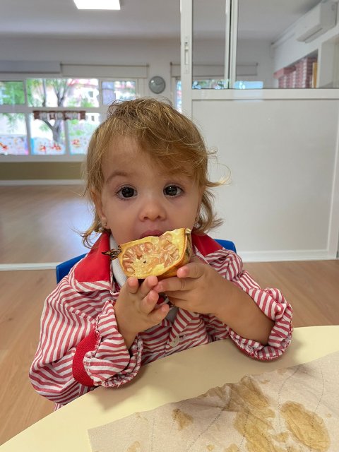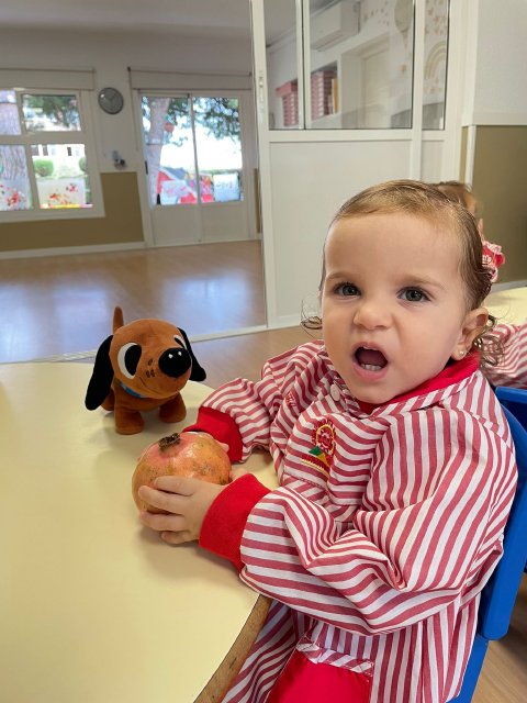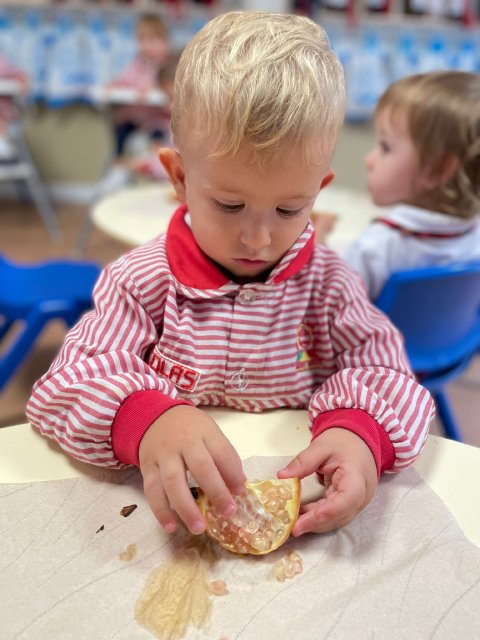 En nuestra clase de Verde 2 hemos celebrado un delicioso taller de frutas de otoño. Los peques pudieron observar, tocar y probar algunas de las frutas típicas de esta estación, como las uvas y las granadas.